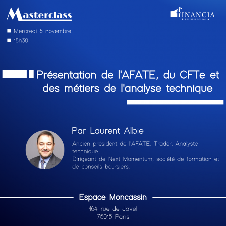 "Mercredi 6 novembre à 18 heures se tiendra notre deuxième Master Class de l'année. Elle sera animée par Laurent Albie qui présentera l'AFATE, le CFTe et les métiers de l'analyse technique."https://www.financia-business-school.co ... embre.html