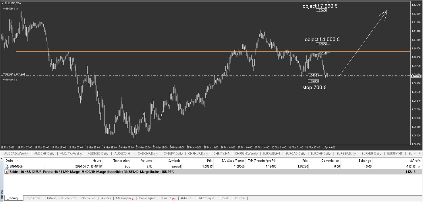 sur l'eurusd, je tente un trade à stop serré sur le dernier plus bas.