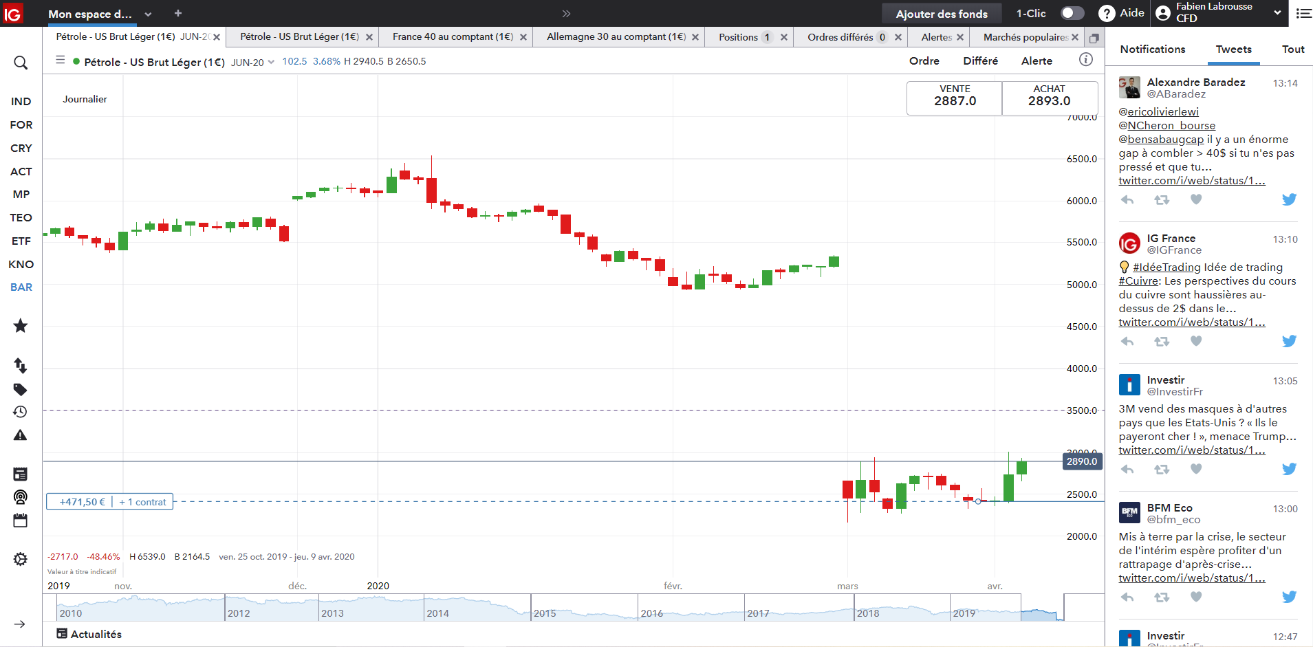 en effet, pour les frais overnight, sur le pétrole, mon broker à fais des frais très gros suite au risque baissier.phil nfp a écrit :petite position mais 21$ x 100 =2100 $ quand memeSinon pour ceux qui se chauffe au fuel il peuvent remplir leur cuve de 1 500 litres! Mais l 'hiver prochain le fuel risque d 'etre plus cher, moins cher il faudrais que le livreur vous donne de l 'argent...fab tient nous au courant des frais overgnigt sur ton CFD .