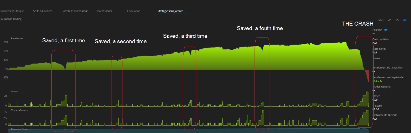 Phase 2) La phase dite de Hauts-Plateaux. Cela consiste, ici, à tout simplement stopper les opérations sur le compte de trading durant toute la période comprise entre le moment où la performance a été réalisé et le 1er jour ouvrable du mois calendaire suivant, la courbe d'équité dessinant ainsi un "Haut-Plateau". Cette phase dure approximativement 66.6% du temps et permet de calmer toutes les parties en prise avec le Darwin PDC, quelles qu'elles soient. Un avantage supplémentaire est qu’apparemment, les 1.2% de fees annuels sont alors divisés par 2 pour cause de Darwin "inactif" durant au moins 15 jours de suite. L'investisseur ne sera donc redevable que de 0.6% de fees annuels.