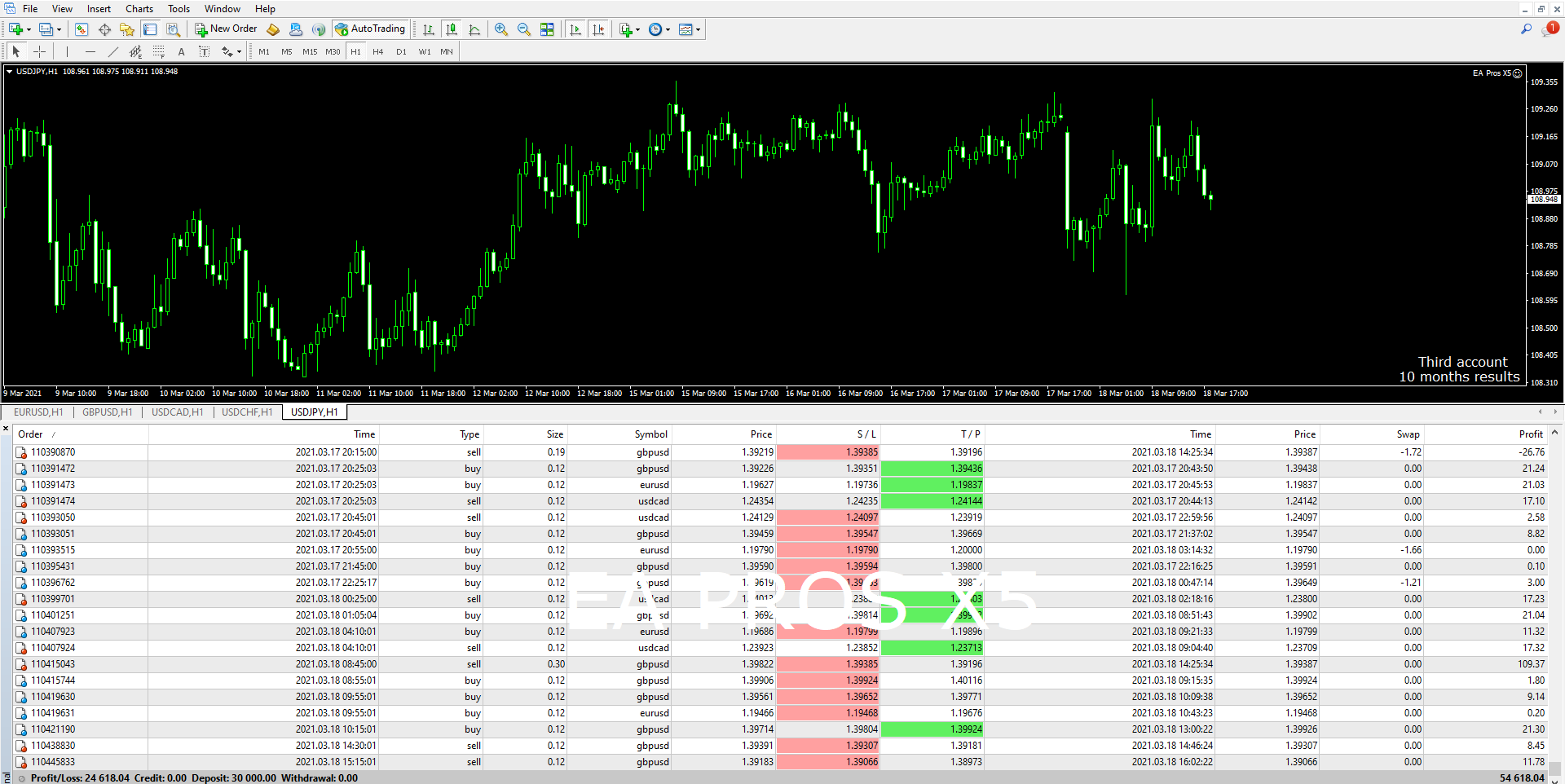 EA Pro X5 fonctionne avec TF M5-H1, les meilleures paires Eur/Usd, Gbp/Usd, Usd/Cad, Usd/Chf...