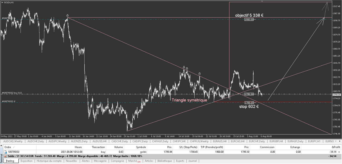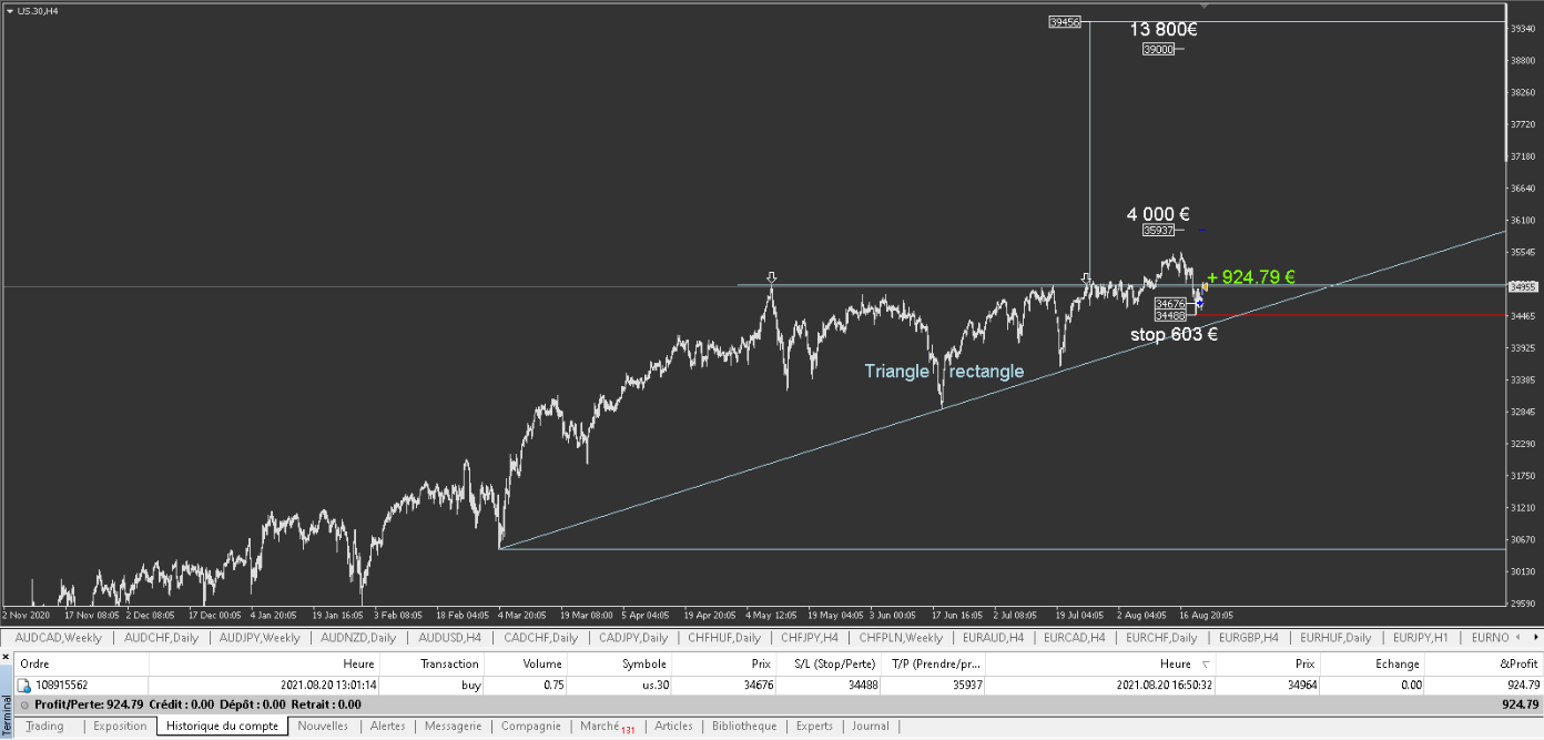 je suis rentré comme d'habitude, toujours un stop de 600 € j'ai pris l'objectif le plus petit du triangle, c'est à dire son plus haut.