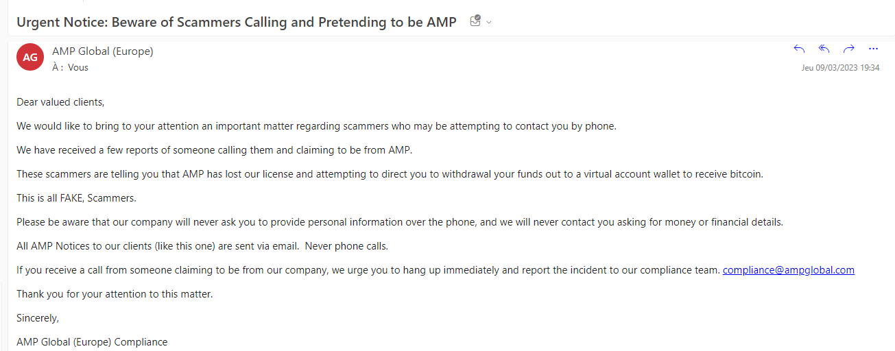 Ces escrocs vous disent qu'AMP a perdu notre licence et tentent de vous ordonner de retirer vos fonds sur un portefeuille de compte virtuel pour recevoir des bitcoins.