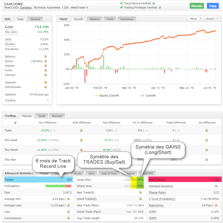 En effet, après six mois de track record live qui colle au backtest de plus de 10 ans, la stratégie prouve un équilibre non recherché, non optimisé et c'est le Marché qui retourne ces résultats flagrants :