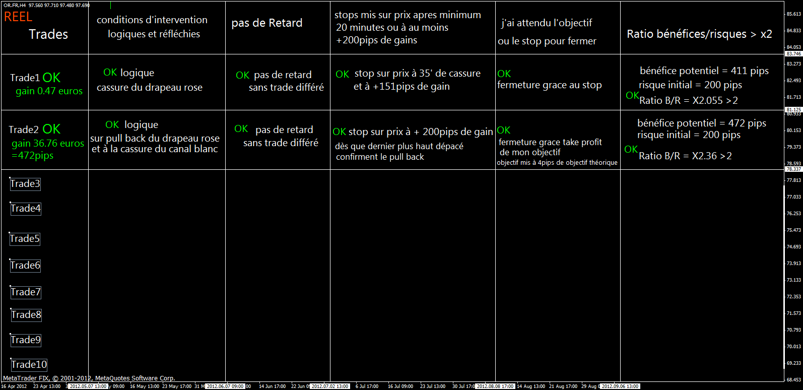 la diapo précédent ce message montre mon intervention à la cassure du petit canal blanc qui est le pull back de la premiere cassure du drapeau rose et c'est mon trade 2(gain 36,76 euros c'est à dire 472 pips. le premier trade était réalisé pile a la cassure du drapeau (trade1)(gain 0.47 euros) faible gain, mais j'ai bien agi selon mes critere de rigeur.