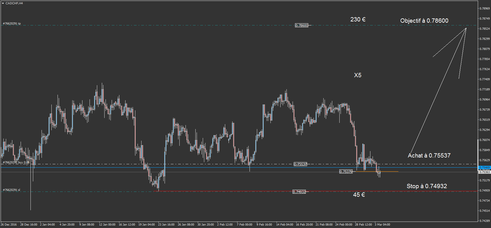 CADCHF acheté à 0.75537 stop à 0.74932 objectif à 0.78600 je risque 45 € pour un objectif à 230 €