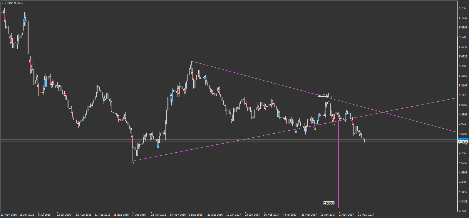 J'attend un pullback sur le triangle mauve pour investir à la baisse sur le GBPPLN mais c'est un triangle daily