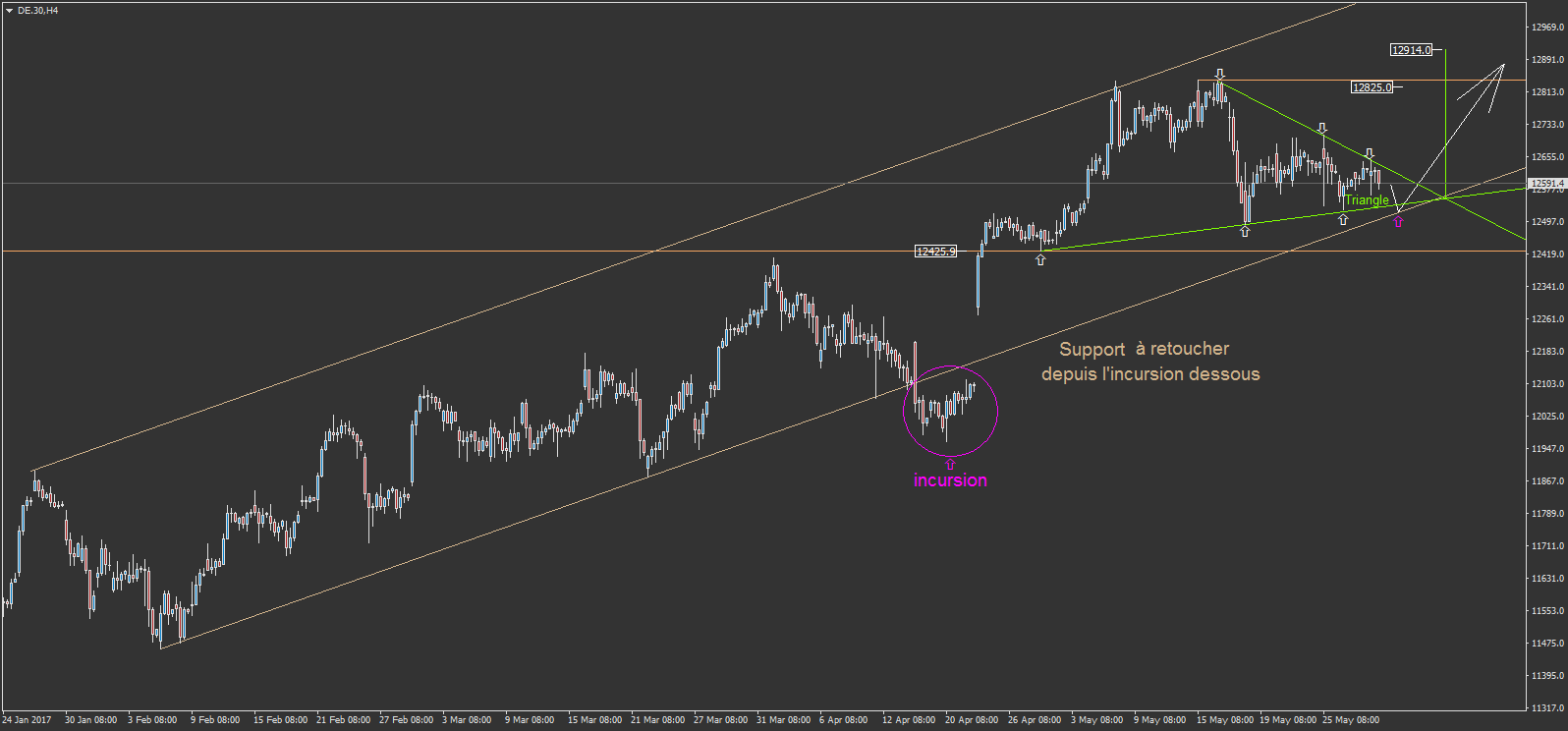 TIEN TIEN!!! sur le DE.30 (DAX30) il y a un scénario très intéressant! il y a un triangle vert 3 point précis sur le support et 3 points précis sur la résistance. et il y a un ancien support gris qui doit être retoucher selon moi. donc!, il peut y avoir une fausse cassure baissière, juste pour toucher le support gris, puis une réintégration du triangle vert, avant de le casser finalement par le haut!!!! cela reste un scénario intéressant, car les objectifs théoriques sont haut pour un stop serré, reste à trouver où rentrer un position. bien entendu, rien ne garantie la réussite de ce scénario qui n'est finalement qu'un hypothèse, bien que lié à une étude poussé de certain éléments.. en effet aussi poussé que puisse être une analyse, la plus simple des analyse, pet être la bonne aussi. et oui, c'est comme ca!!!