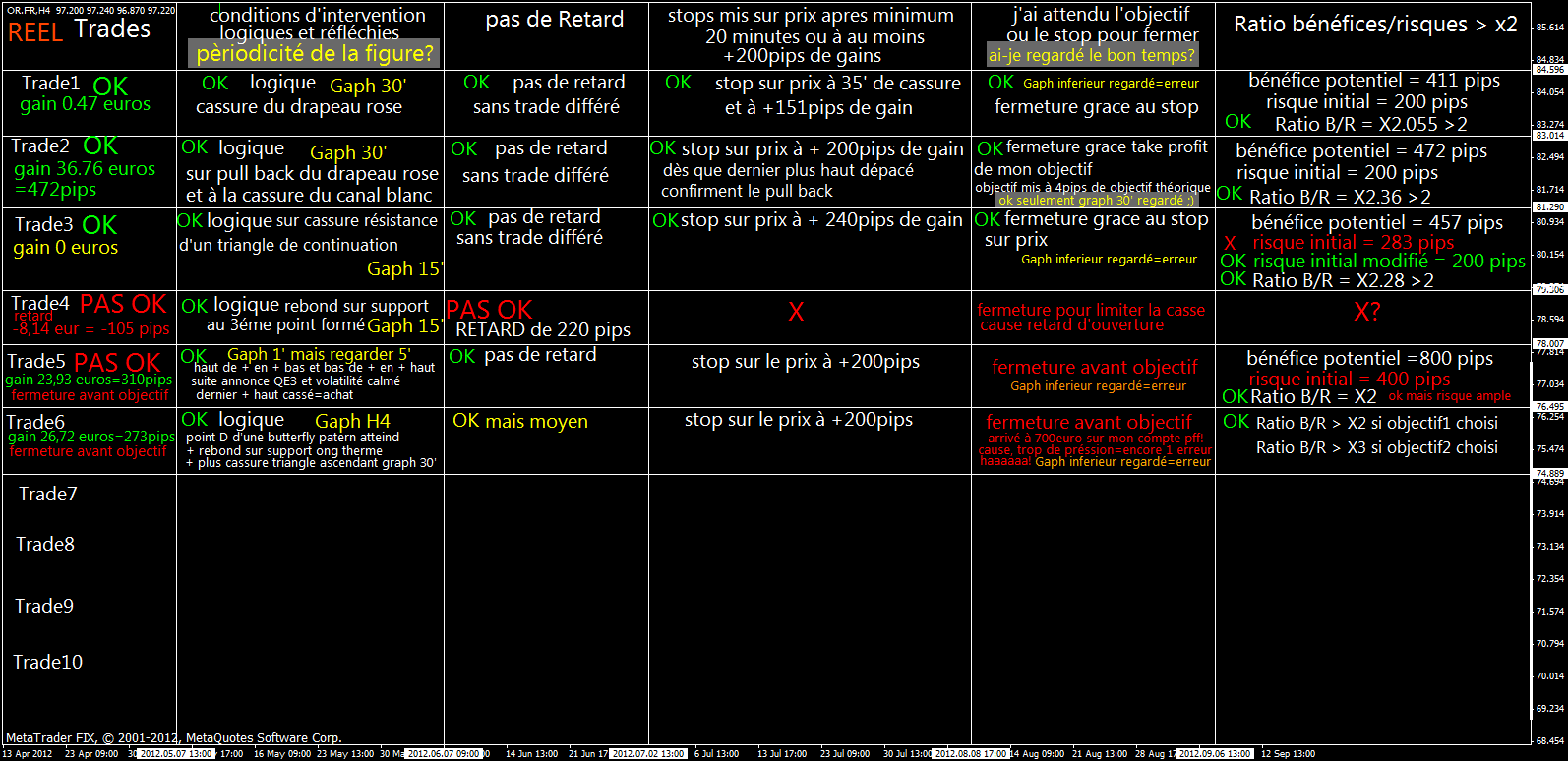 par exemple, ma premiere erreur faite au trade4(retard), a généré une petite perte qui m'a, si je regarde mon ressentie, donné une frustration qui est liée au faite d'avoir fermé trop vite autrade suivant(trade5). comme pour vouloir juste ratraper mon erreur.j'ai a ce moment là trop imaginé le résultat financier, au lieu de m'occupé de bien faire les choses, et donc du résultat de cette campagne de rigeur