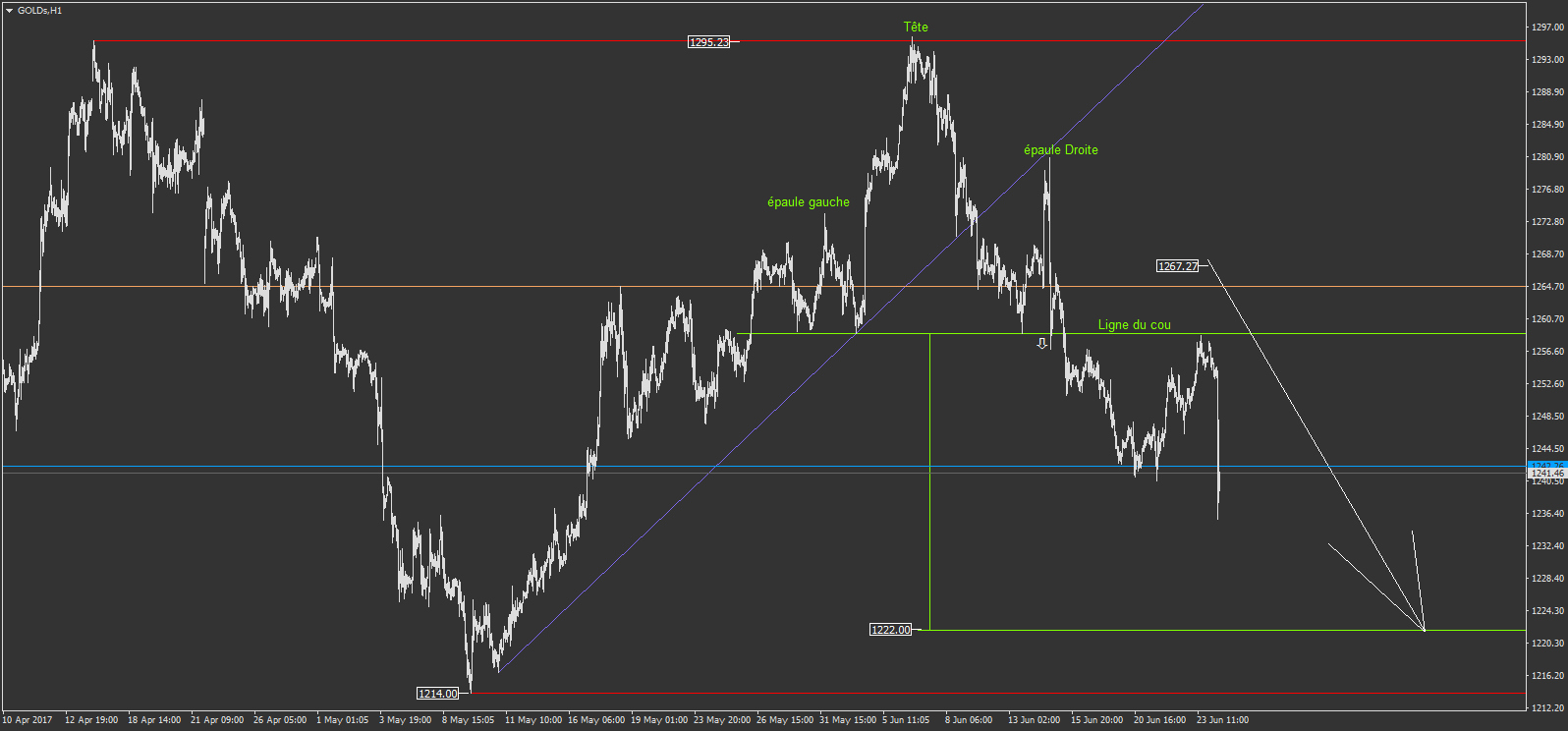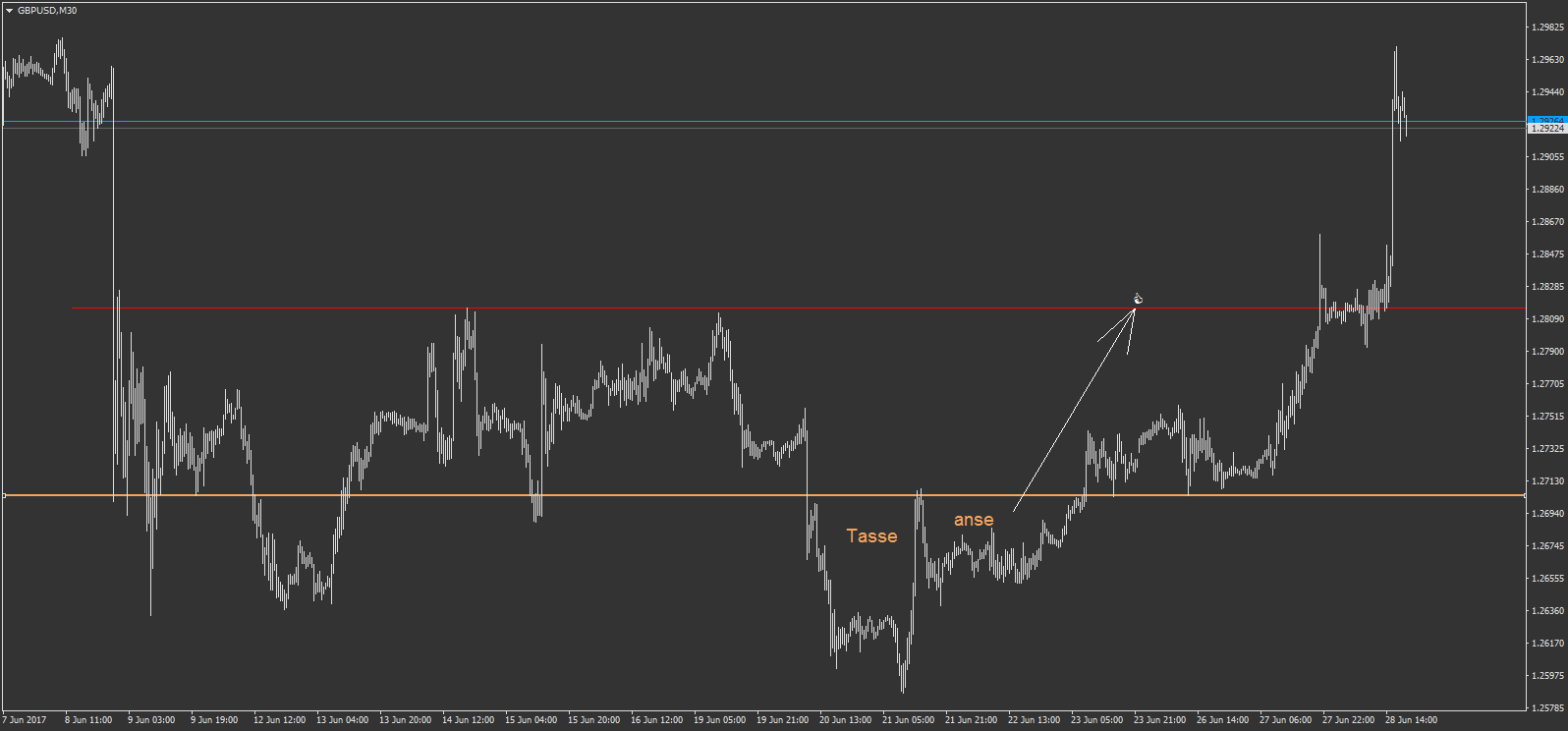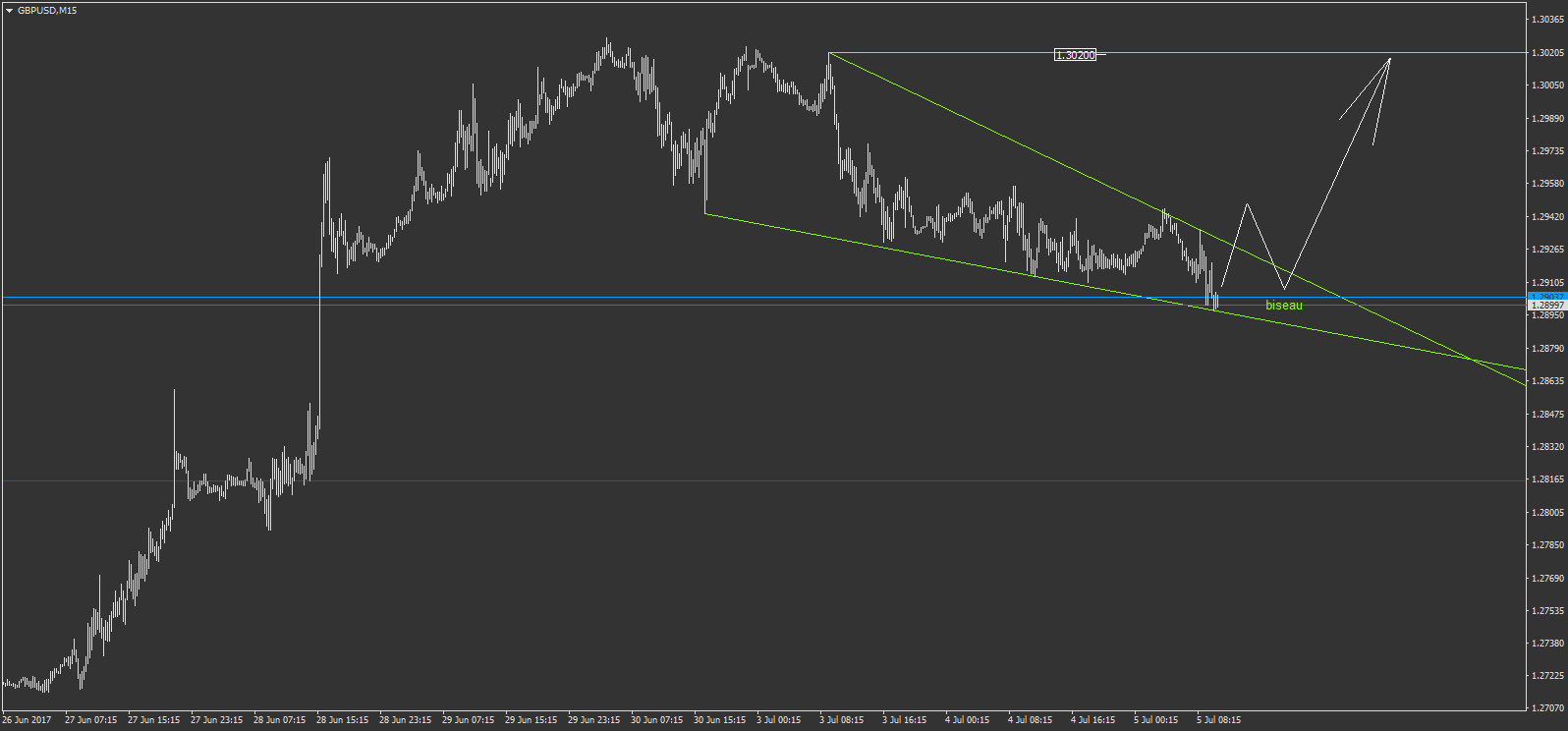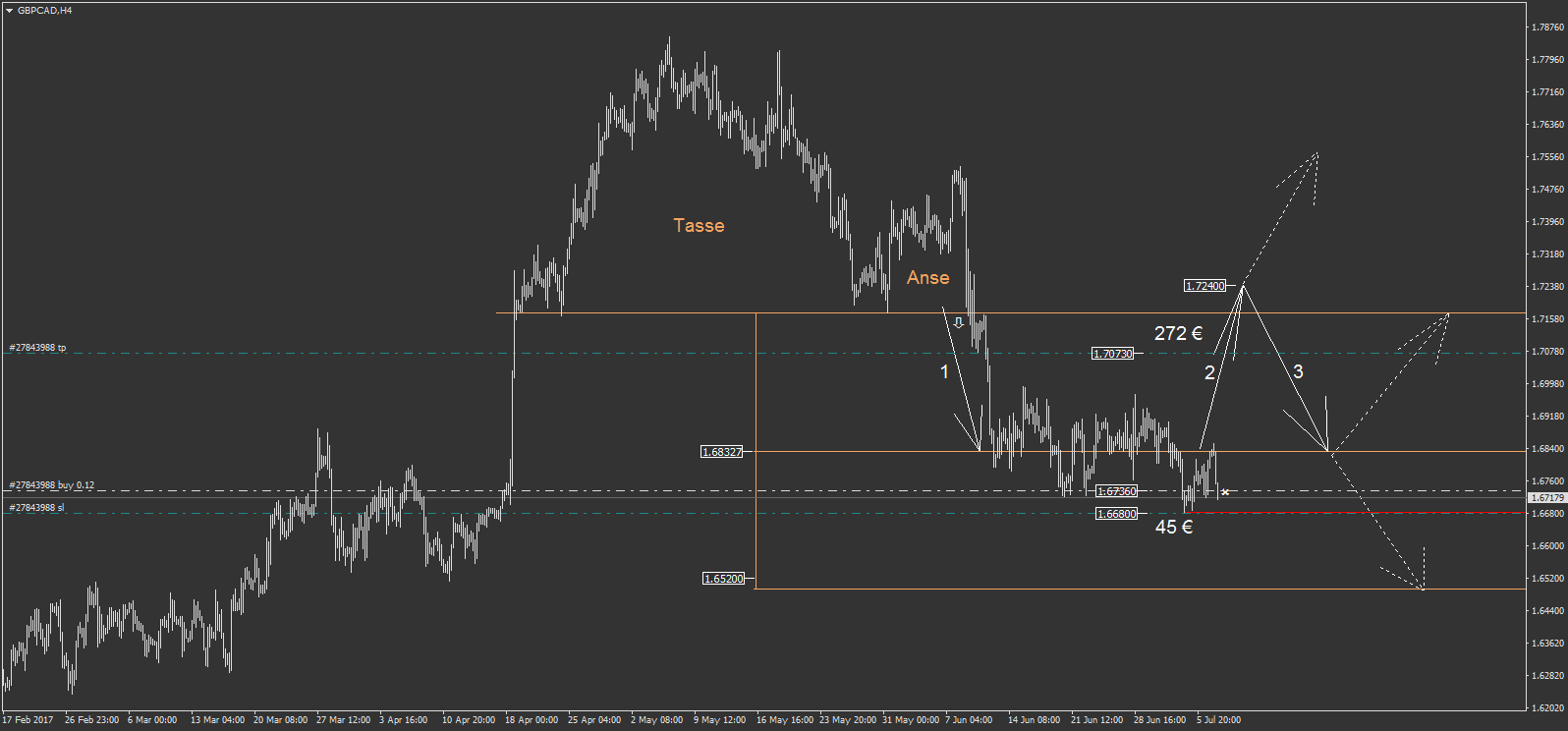 -sur le AUDUSD pour +193 € de gain. mon objectif initial était la ligne bleu foncé, mais je l'ai écourté après avoir anticipé avoir trouvé justement un point d'entré à l'achat sur ce niveau. mais je n'ai pas tenté ce point d'entré à l'achat...