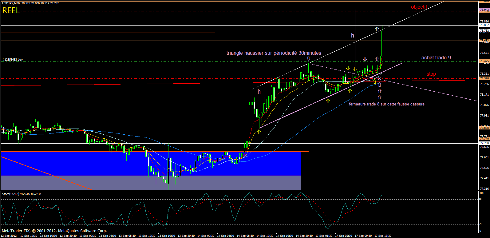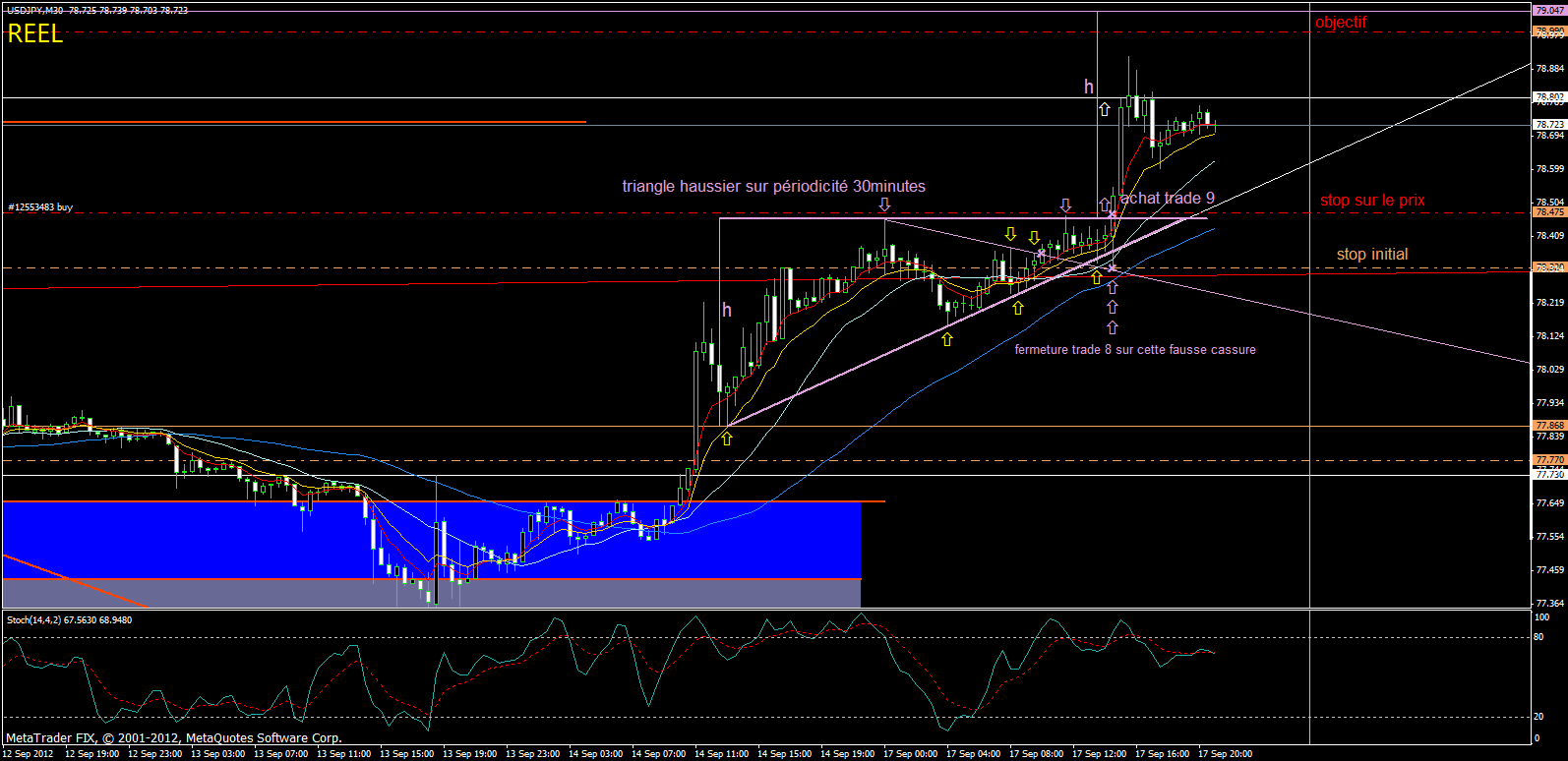 maintenant sur le jpy, je fait un nouveau teste, vous noterai que mon trade 8 à échoué, pusque je l'ai fermé suite a une fausse cassure du support, mais j'ai bien réspecté ma fermeture si le support ete cassé, pas de retard non plus donc super (sauf les 5 euro de perte ici). mais sur l'image qui suis, vous voyé mon trade9 avec intervention à nouveau sur le triangle qui cette fois si à fini je pense de ce former.pas de retard d'intervention. je ferai donc le bilan ds trade 7, 8 et 9 des que j'aurai finit le trade 9