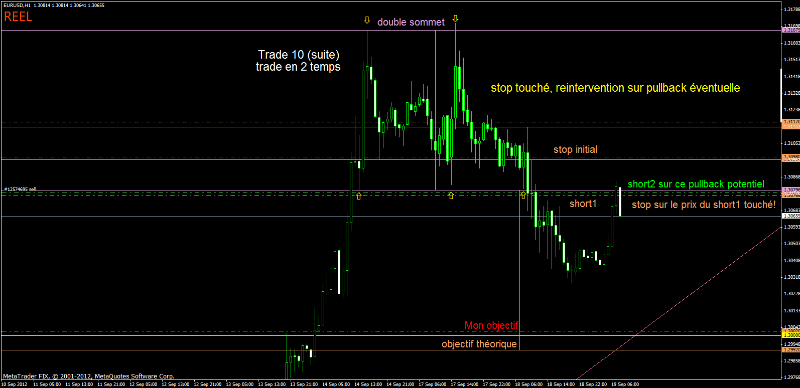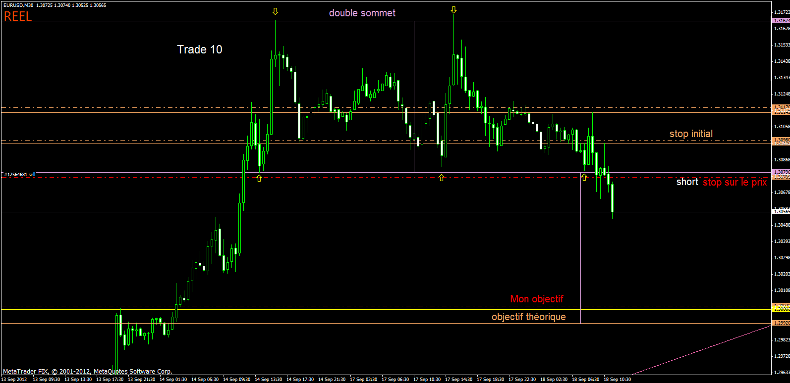 moi pour l'eurusd je vien de repérer un double sommet cassé à la baisse, du cou je suis short avec un stop deja en breakeven un peu rapide (mais dans mes critères de rigeur donc mon rapide que ce que je fesait avant)esperons qu'il n'y aura pas de pullback meme si sur ces figures les pullback sont fréquents. on verra, je regarderai que le graph H1