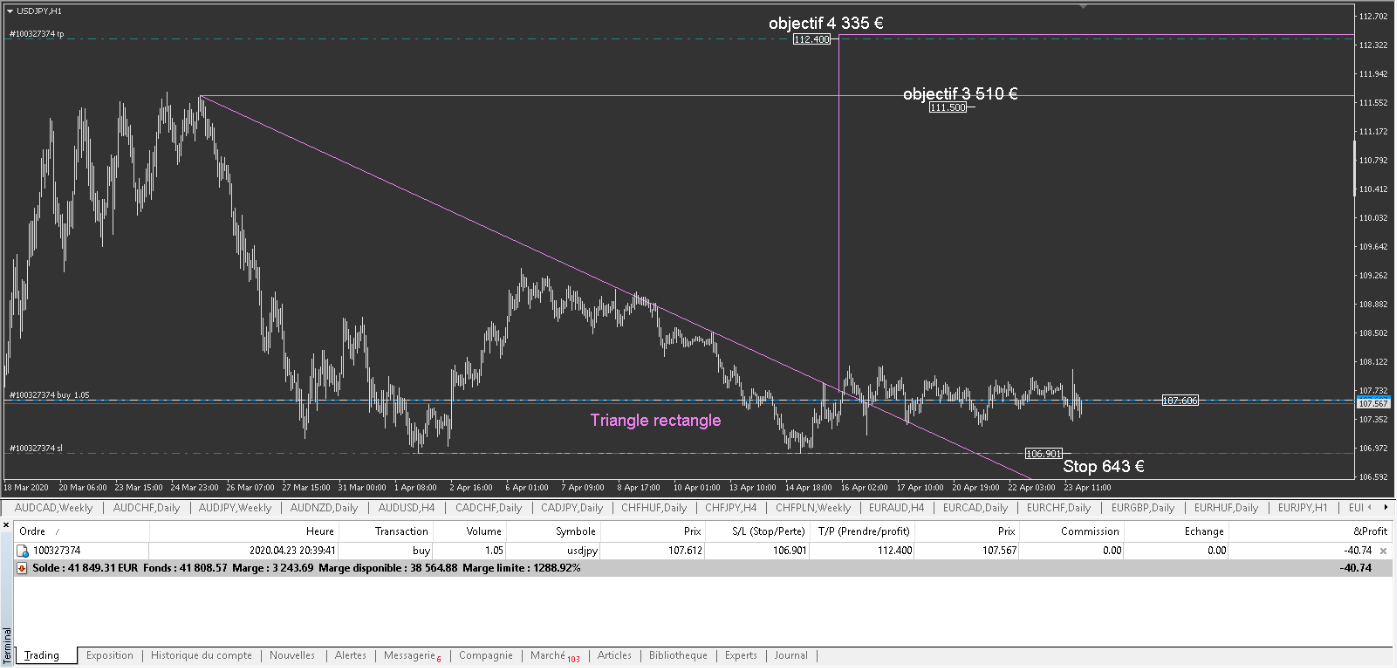 j'ai prévu un ordre d'achat différé si cela se produit. un triangle symétrique H4 à été cassé à la hausse