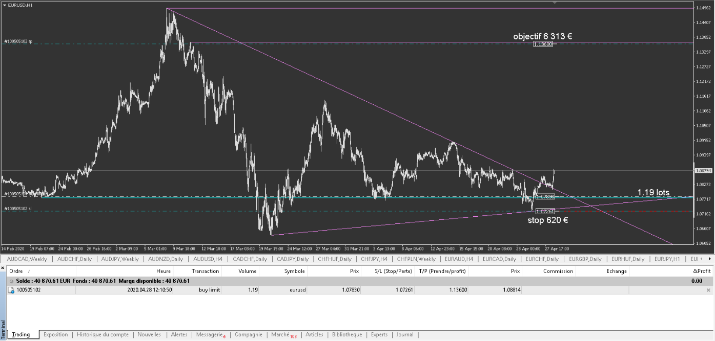 au début, c'était un trade plus court terme, mais maintenant je vise l'objectif de ce triangle mauve formé entre temps, et qui est un très gros par rapport à mon stop de 200 € (6000€) .