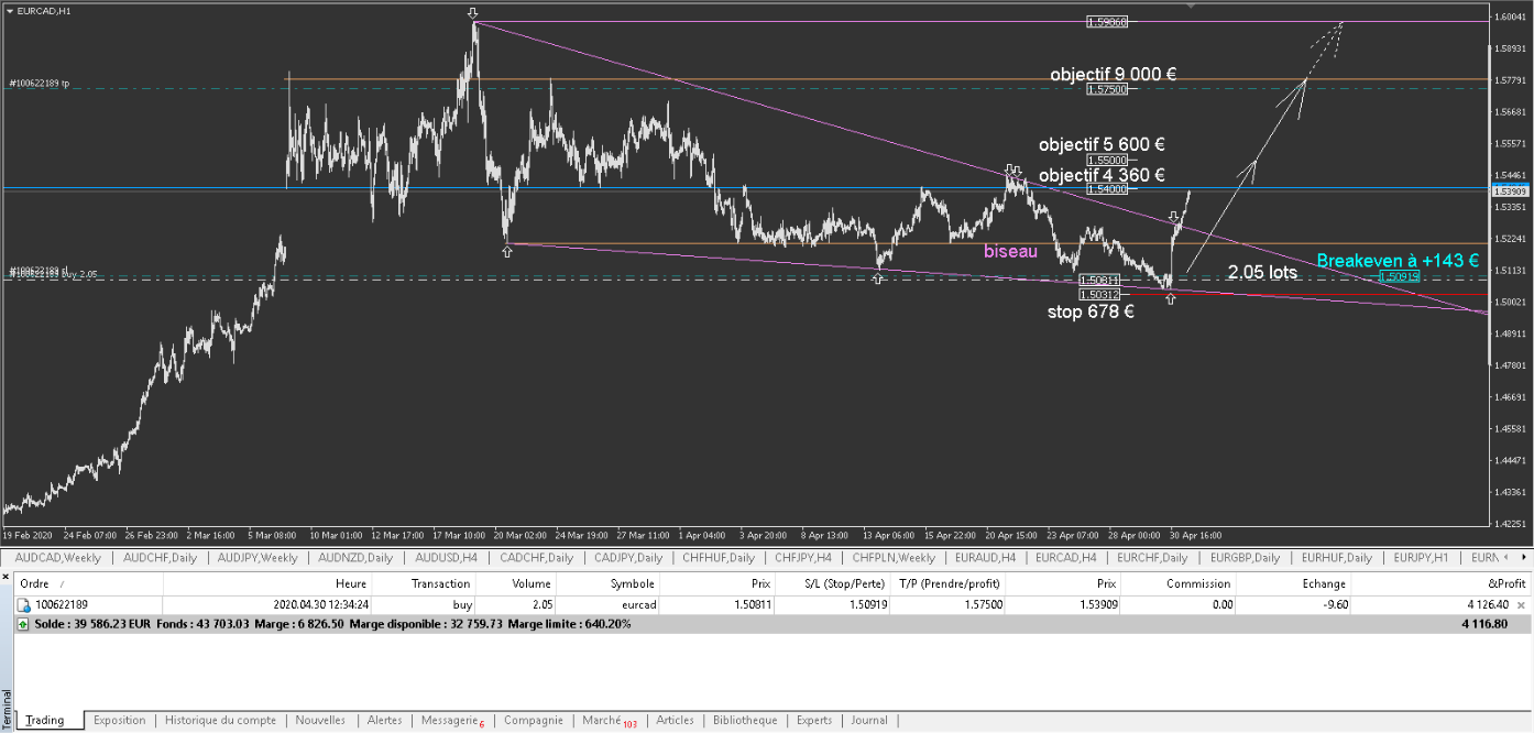 mais je re rentre sur EURCAD car je pense toujours à une fausse cassure baissière de ce Biseau,