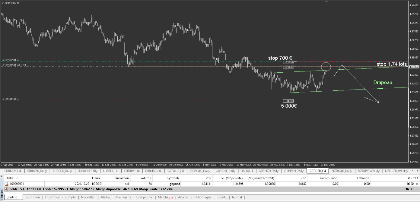 L'idée du trade, c'est que le bas du Drapeau vert soit pris sans que l'on ne vienne prendre le niveau d'invalidation de la Tasse avec anse.