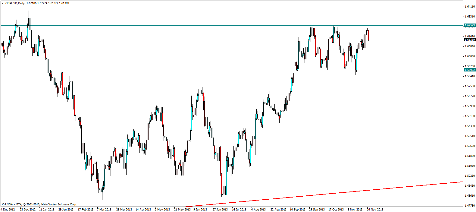En effet en données hebdomadaires la paire GBP/USD teste une résistance oblique de long terme qui coiffe le cours depuis 2009. En outre si l'on passe sur une unité de temps journalière vous noterez que la paire est dans une zone de consolidation à plat uite à la forte accélération haussière (de juin à septembre). Ce range est compris entre 1.6260 pour la résistance et 1.5900 pour le support.