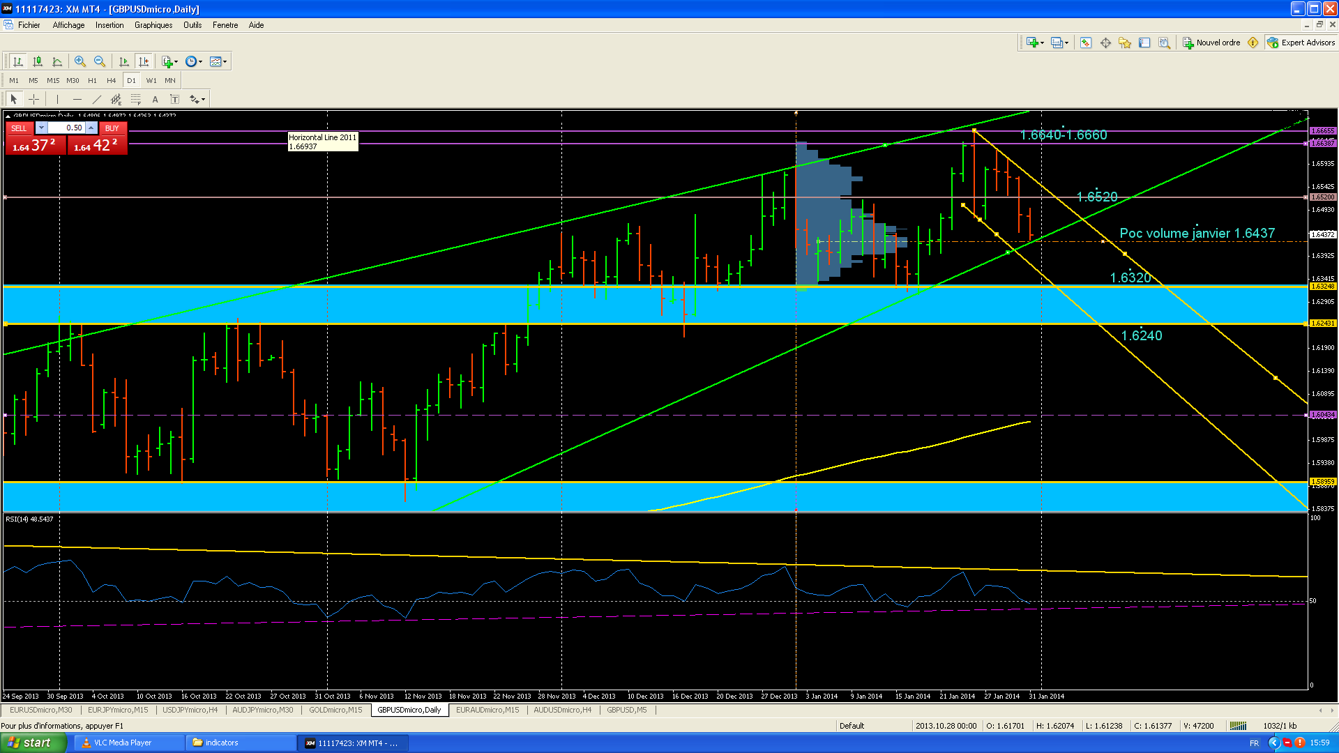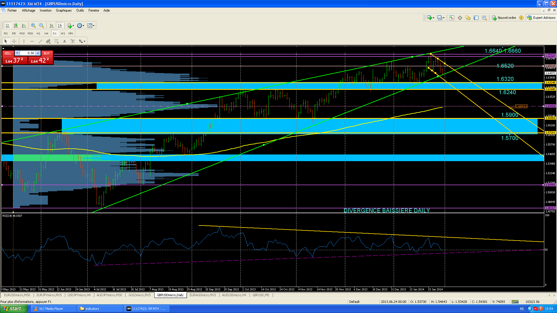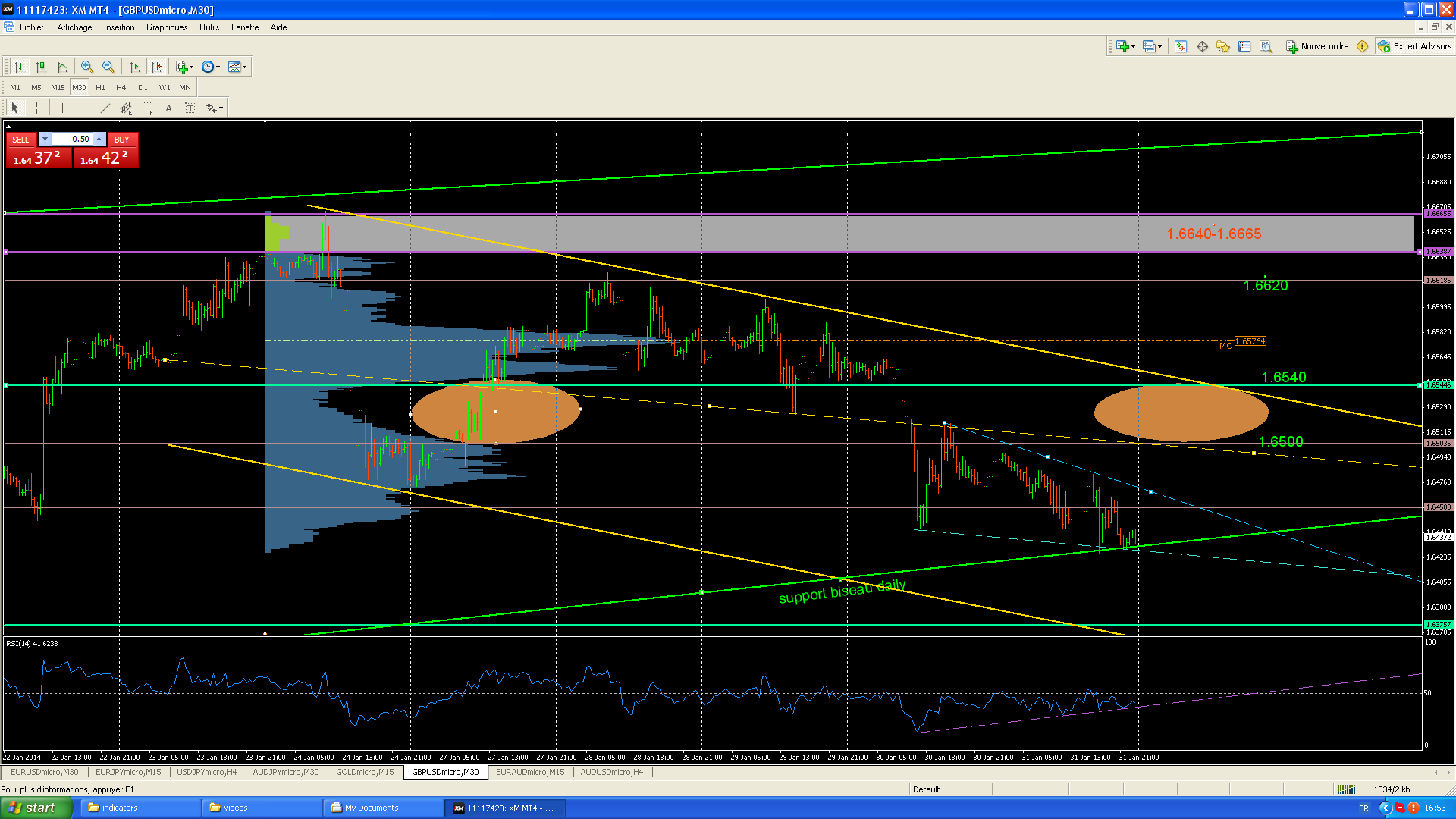 En intraday par contre, le manque de liquidité(elipse orangé graph m30 intra) + biseau descendant(bleu tillé sur graph m30 intra) et divergence haussière du rsi me font pencher pour un scénario bullish avec à court terme 1.6520 voir 1.6540 en objectif.