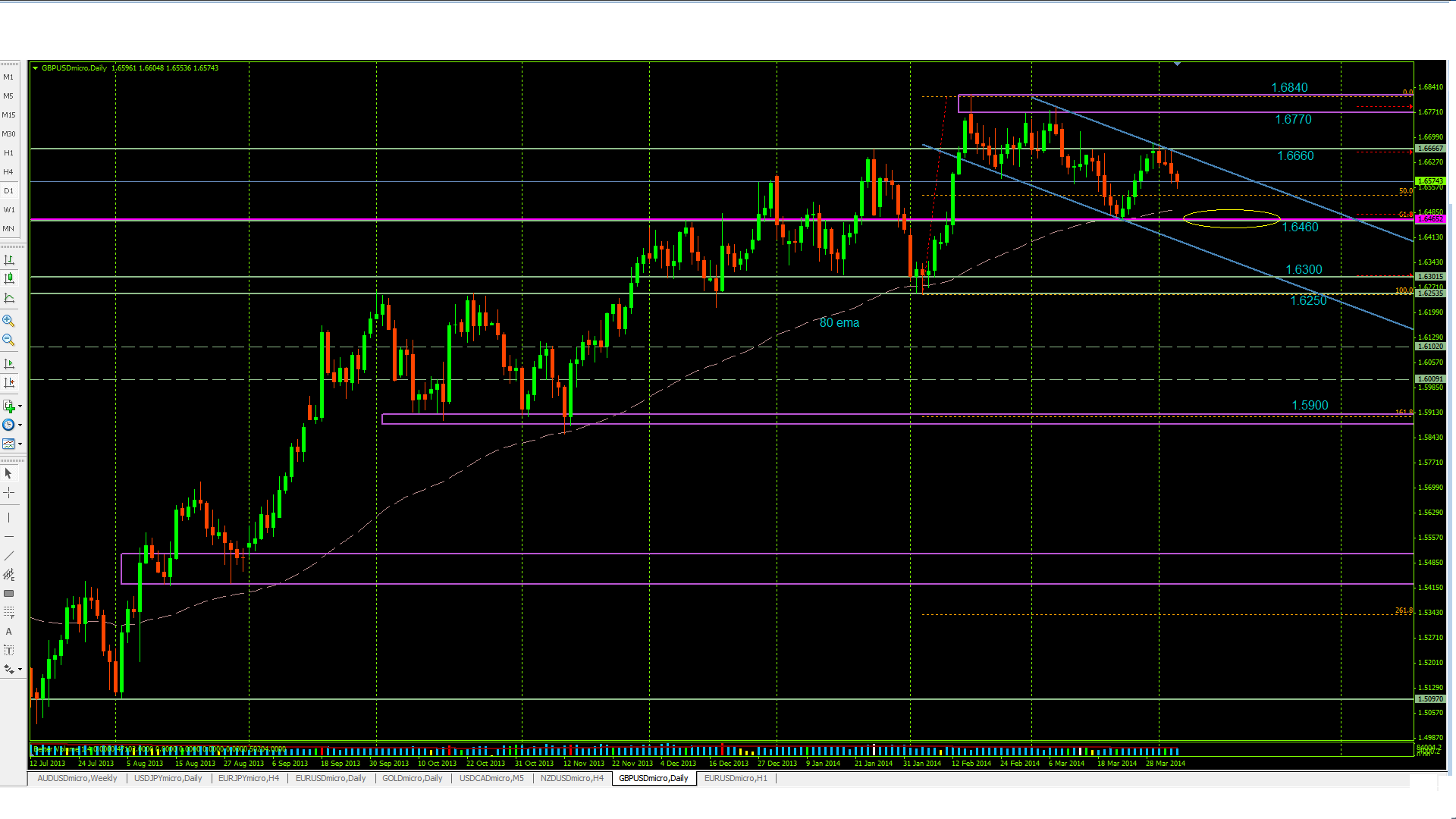 D'apres moi une clôture daily sous 1.6460(plus bas mars+ 61% du swing haussier commencé début fevrier)ainsi que sous EMA 80 daily donnerait une grosse confirmation baissière moyen terme pour aller rechercher 1.63 voir 1.6250 en extension.