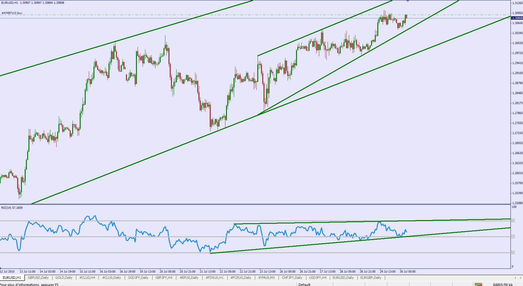 J'ai fixé mon objectif à 1.31 mais avec un peu de recul, je me rend compte que c'est juste au dessus de la résistance horizontale qui avait stoppée les assauts haussiers du 10/05/2010 matérialisée en bleu marine sur mon graph.