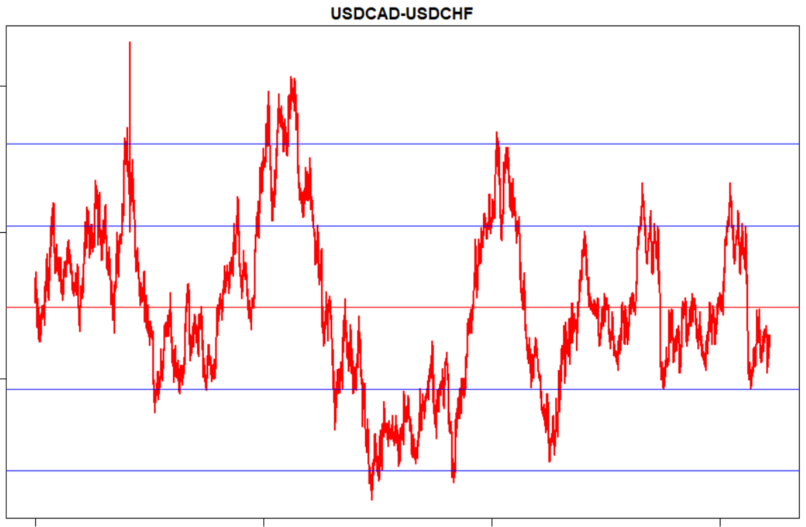 Pour exemple, j'avais aussi calculer pour chacune des combinaisons possible des 26 paires forex suffisamment liquide (spread max ~3pips), la régression linéaire de leur spread respectif à laquelle j'avais ajouter 1 et 2 écart types.