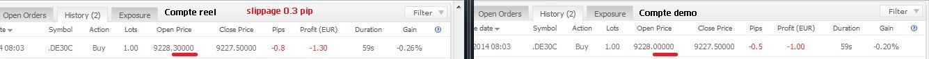 Slippage de 0.3 pip entre le compte reel et demo avec JFD sur un ordre différé.