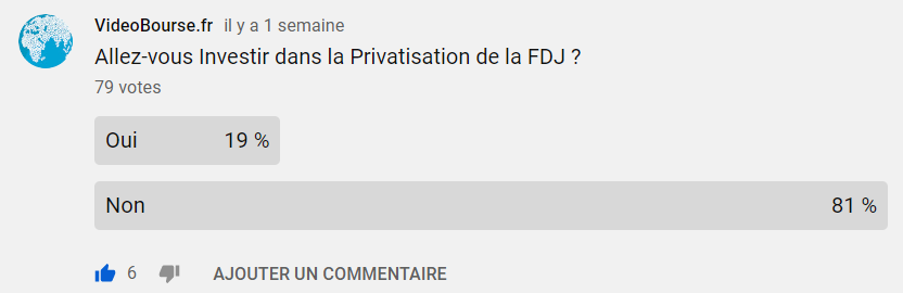 Sinon, voici les résultats des sondages relatifs à la privatisation de la FDJ que j'avais lancé la semaine dernière sur VideoBourse et sur les réseaux sociaux :