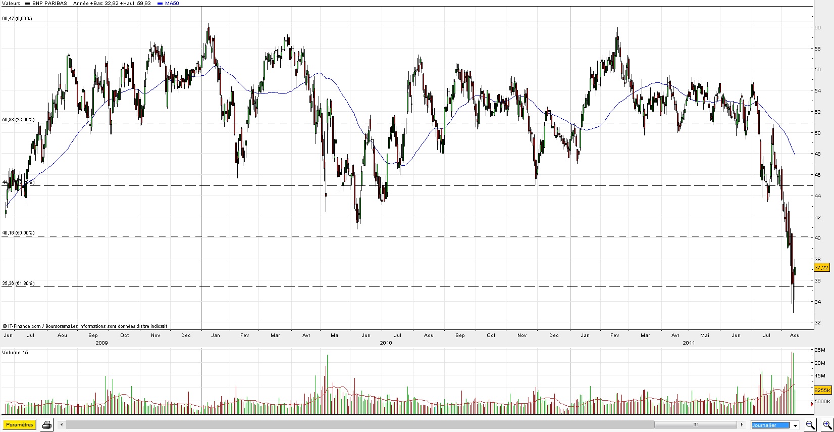 Par exemple BNP retrace 61.8% du mouvement haussier observé depuis la fin de la crise des su-primes en mars 2009. Ca me semble être un point d'entré long intéressant à court terme, mais il faut se protéger vu le contexte fondamental tendu.