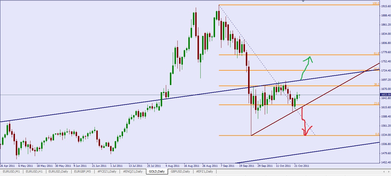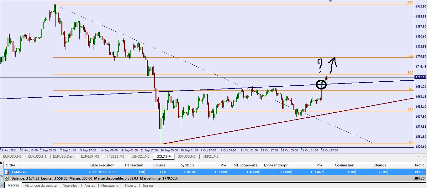 Pour moi on a cassé la résistance oblique haussière long terme (encore) désormais on est juste en dessous du retracement de 50% de la dynamique baissière observée depuis début septembre sur l'or.
