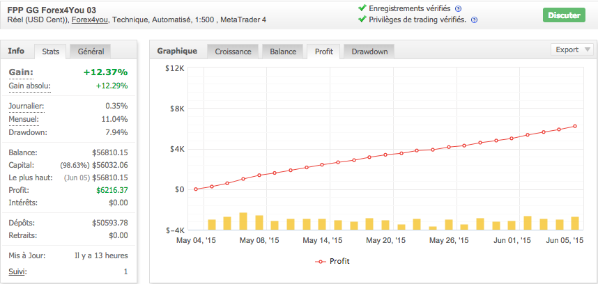 Rendement s/capital déposé : % 17.37Voici un premier pointage après quelques jours.FullPips a écrit :Dans le but de faire un essais comparatif en parallèle, j'ai ouvert 3 nouveaux comptes :