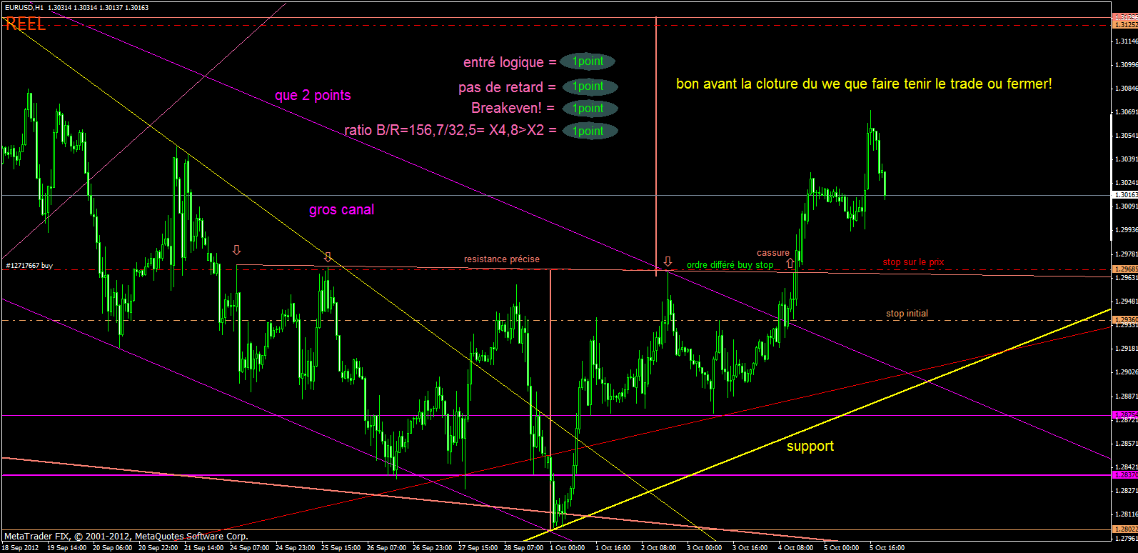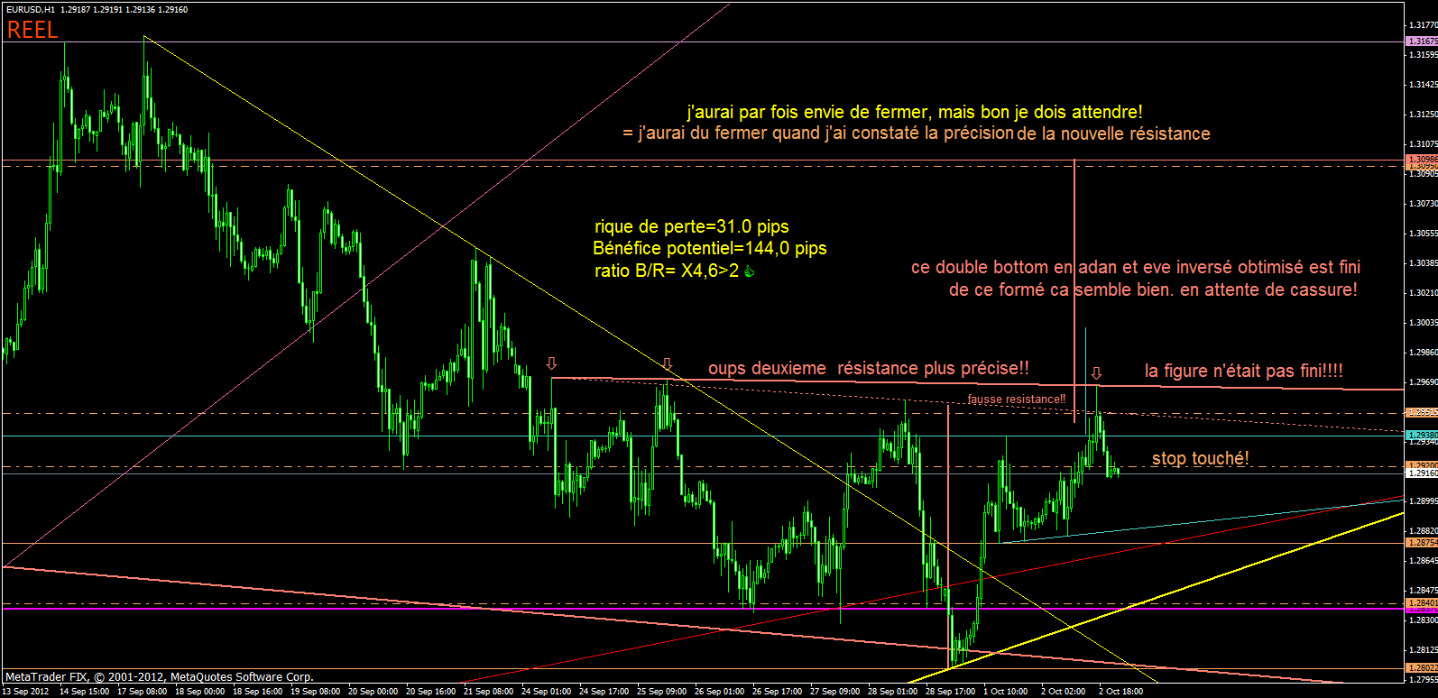 ta raison , meme si ca peu etre tentant de déplacer son stop, il faut pas le faire. moi par exemple, j'avait le meme stop que toi, et je l'ai laissé (des envie me disai de le bouger, mais j'ai pas pu le faire grace a mon tableau de rigeur yes!). par contre faut que je voix un truc , car sur mon trade, j'avait apres cou des doute sur la résistance qui venait d'etre cassé, et juste apres la cassure, on a précisé un troisieme point pour une résistance plus précise et meme d'une précision chirurgical. à ce moment là mon tableau disait ne ferme pas pour laisser le stop fermer et bien asumé le risque de dépard, mais mon tableau me disait aussi : si tu t'apercois que ta ligne de tendence , et donc ta figure n'était pas fini alors ferme sens hésité. j'ai remarqué la ligne de tendence, mais je n'est pas fermer. c'était dur de réagir en plus j'aurai rien perdu en fermant au momentou je m'en suis appercu. donc petite suptilité qu'on voi bien mieu en immage.c'est ce type de piege que je découvre depuis peu(par contre en suivant ma rigeur j'ai juste perdu ce ce que je devait perdre si ma figure était invalidé.