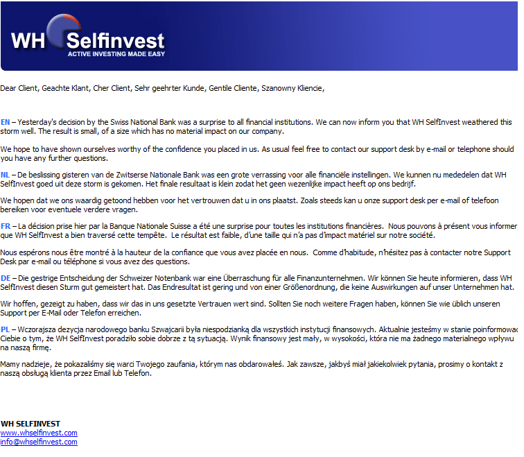 Despite an unprecedented strengthening of the Swiss Franc during the trading session on Thursday, January 15th, the most of our client were able avoid serious losses thanks to the preventive actions made by our Company to increase marginal requirements for the EURCHF currency pair.