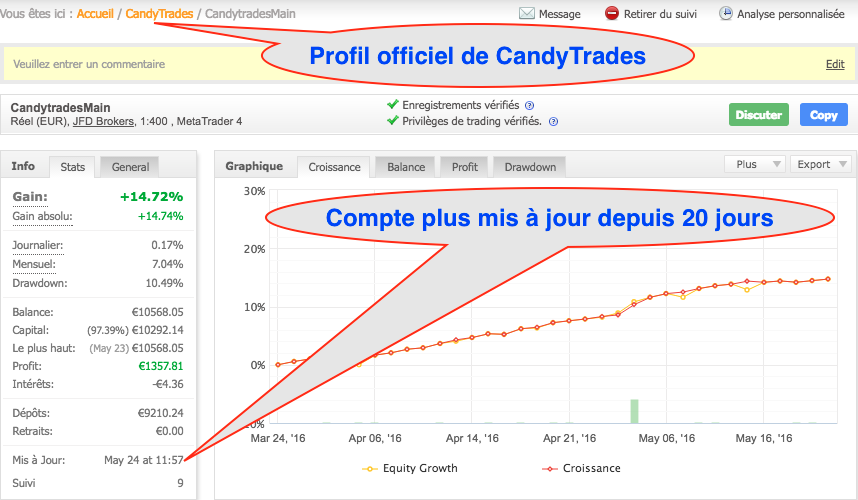 Lorsque sur le profil officiel de CandyTrades sur MyFxBook, il y a un compte 'CandyTradesMain' je m'autorise à penser qu'il s'agit d'un compte 'officiel' des auteurs du signal.