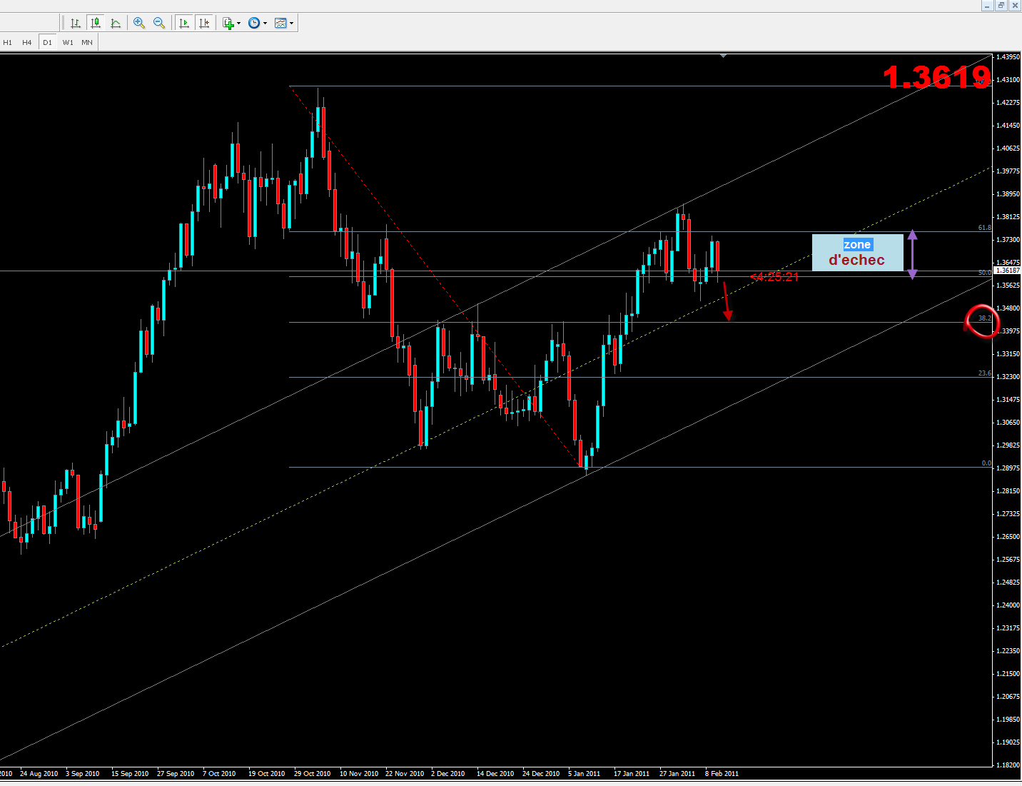 En cas de cassure baissière de 1,3650 nous attendrons ensuite une cassure baissière de 1,36 pour conseiller d'entrer / de ne trader plus que les positions shorts sur la parité.