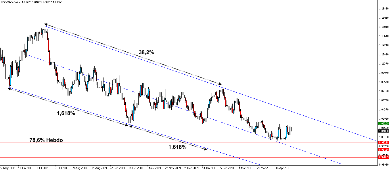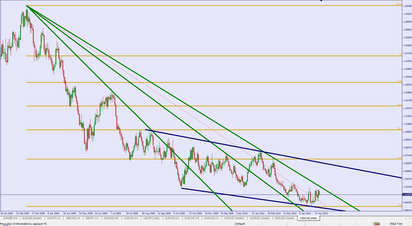 Depuis septembre 2009 on notera tout de même une accalmie et une baisse de régime dans l'accélération baissière observé depuis mars 2009, comme l'indique les supports et résistances obliques bleus.