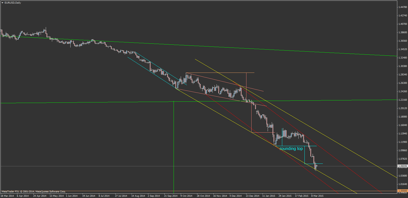 en mois, on a toujours un gros triangle qui avait cassé (en vert). on y a pas encore fait de pullback, et la paritée c'est environ la motier de l'objectif. je pense donc qu'il y aurra surement des prises de bénéfices. mais avant, je pense qu'il peut y avoir une construction de figure qui nous précisera un peu plus les choses. pour l'instant, on vient d'arriver à l'objectif d'un rounding top. comme souvent, à l'atteinte d'un objectif, on commence à former une figure. on voit un support jaune à 3 points pouvant servir d'appuis à la construction d'une figure. il y a par contre le canal rouge, qui pourrait proposer sont support avant la parité.