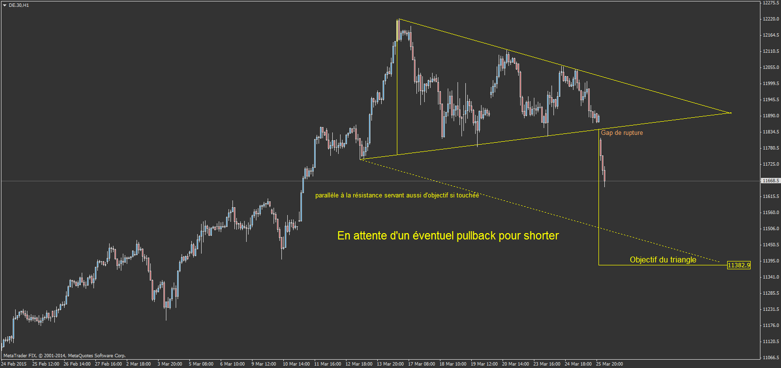 Alors sur le Dax, j'ai des amis qui ont tremblé avec cette tendance haussière qui n'en finit plus. mais effectivement, il y a ce triangle qui à cassé à la baisse.L'objectif que tu as choisi coïncide bien avec l'objectif de ce triangle. C'est un triangle bien formé qui casse un peu tôt pour un triangle symétrique par contre.