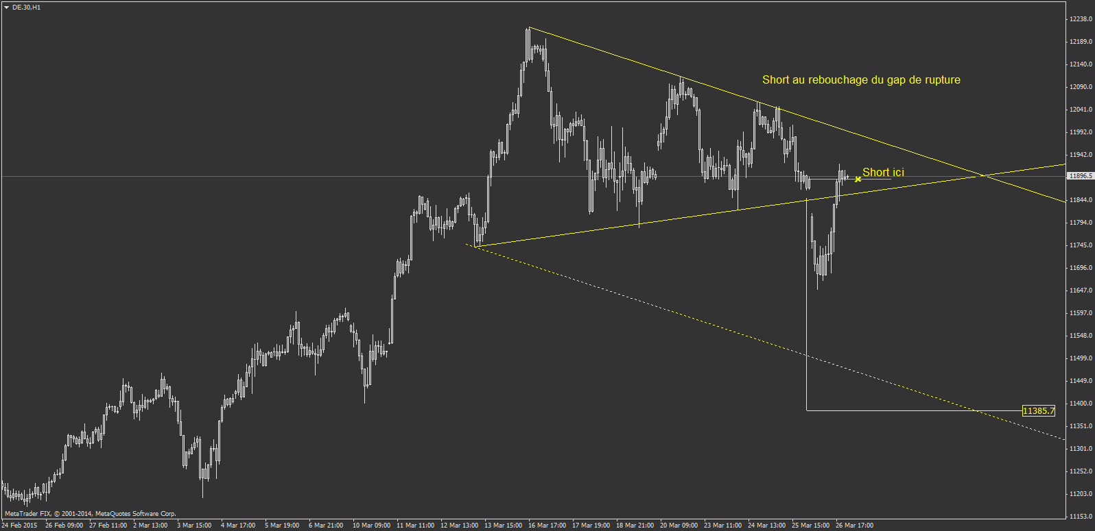 En attente du pullback pour tenter un short. il y a un gap de rupture, c'est à dire que la cassure à été faite par un gap, ce qui renforce l'idée du trade. si ce gap de rupture se comble, ou au retour sur le triangle, j'imagine un short sur pullback donc.