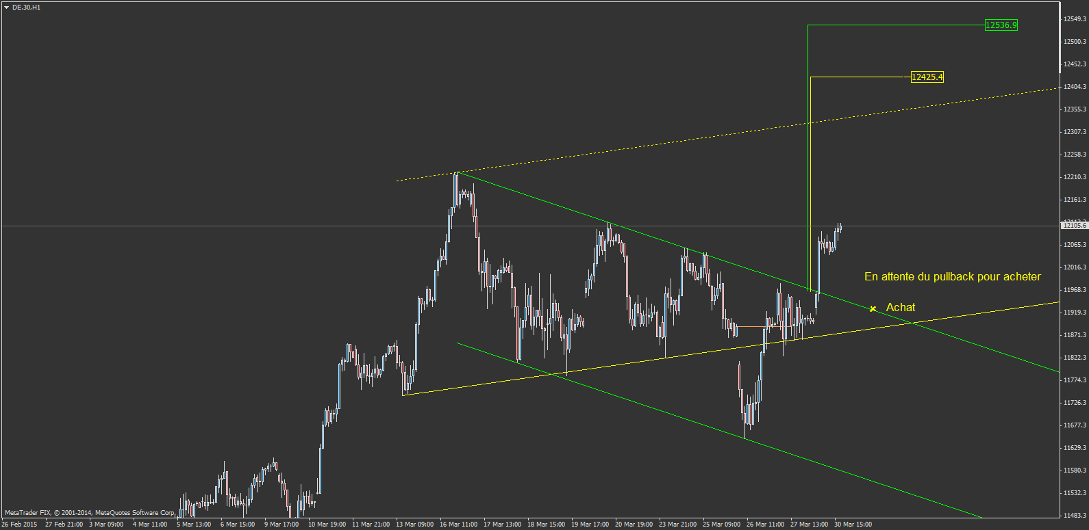 le Dax poursuit ca hausse vars l'objectif chartiste du drapeau vert (12536), aidé d'un biseau jaune cassé à la hausse et dont l'objectif est lui à 12506