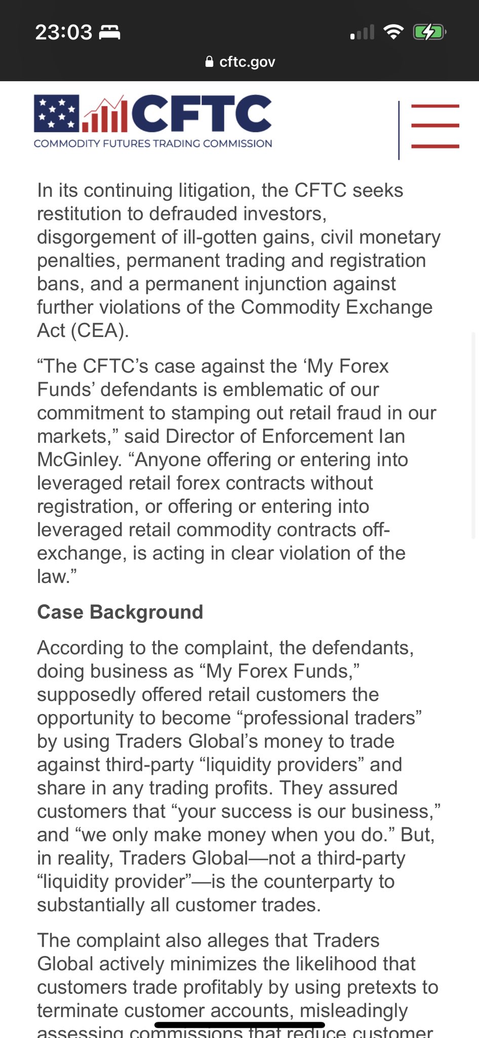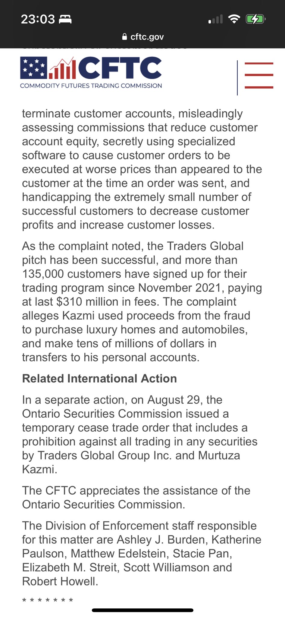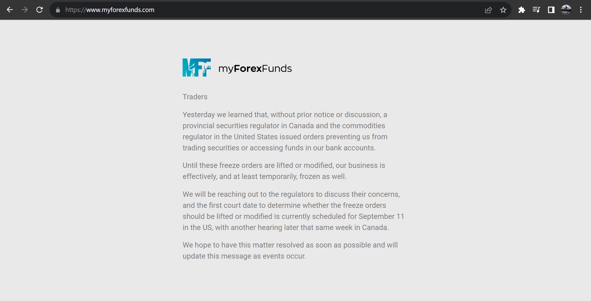COUP DE TONNERE DANS LE MONDE DES PROP FIRMS !!!! LE REGULATEUR CANADIEN ET AMERICAIN VIENNENT DE GELER TOUS LES COMPTES DE MFF ET SON SITE WEB !!!! LA PLUS GROSSE PROP FIRM AU MONDE EST SUSPENDUE A UNE DECISION DE JUSTICE LE 11 SEPTEMBRE PROCHAIN : https://www.myforexfunds.com/
