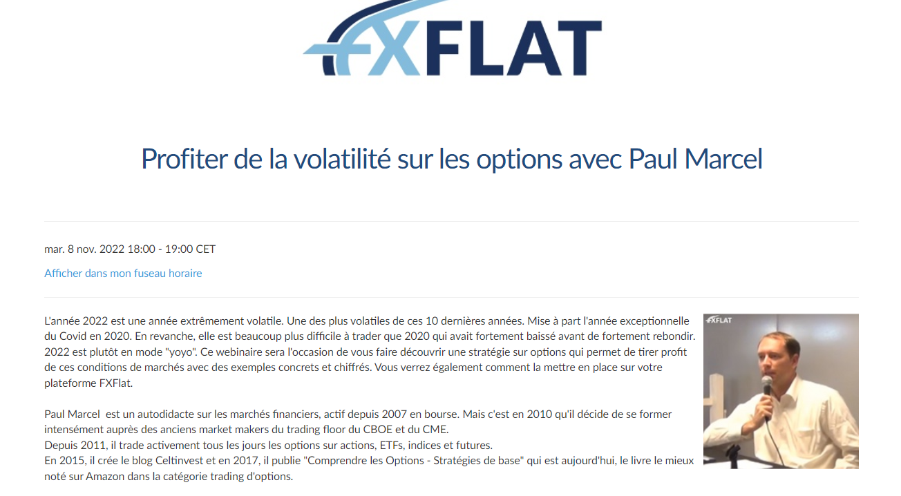 L'année 2022 est une année extrêmement volatile. Une des plus volatiles de ces 10 dernières années. Mise à part l'année exceptionnelle du Covid en 2020. En revanche, elle est beaucoup plus difficile à trader que 2020 qui avait fortement baissé avant de fortement rebondir. 2022 est plutôt en mode "yoyo". Ce webinaire sera l'occasion de vous faire découvrir une stratégie sur options qui permet de tirer profit de ces conditions de marchés avec des exemples concrets et chiffrés. Vous verrez également comment la mettre en place sur votre plateforme FXFlat.
