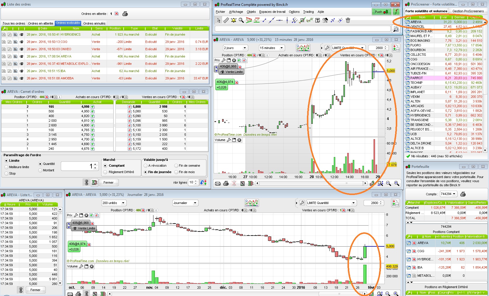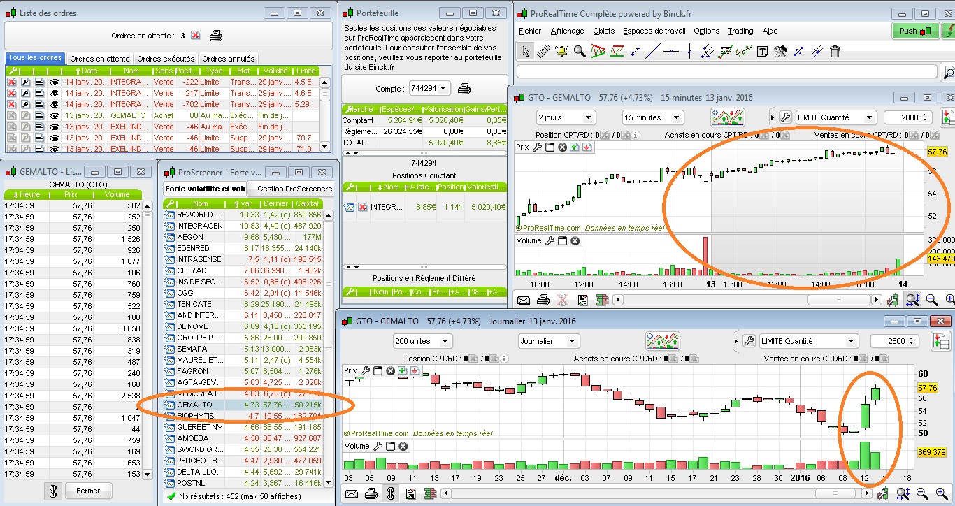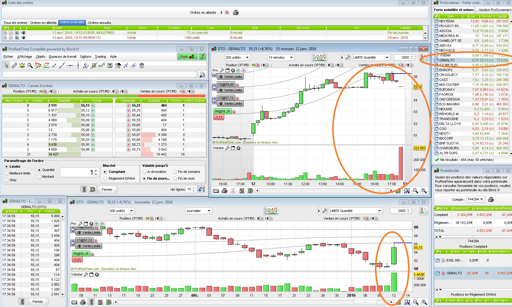 J'avais acheté le titre EXEL INDUSTRIES pour 5000€ hier soir, que j'ai clôturé avec un peu de profit ce jour:Ce jour j'ai acheté le titre GEMALTO pour 5000€, malheureusement, si le profil du titre était très intéressant à 17h quand j'ai ouvert le trade, la clôture puis le fixing n'ont pas étés bons:On verra demain ce que ça donne, on reste sur une belle impulsion sur l'ensemble de la journée. J'ai 3 ordres, 2 de 1000€ assez proche et le reste plus haut si l'action décolle demain.