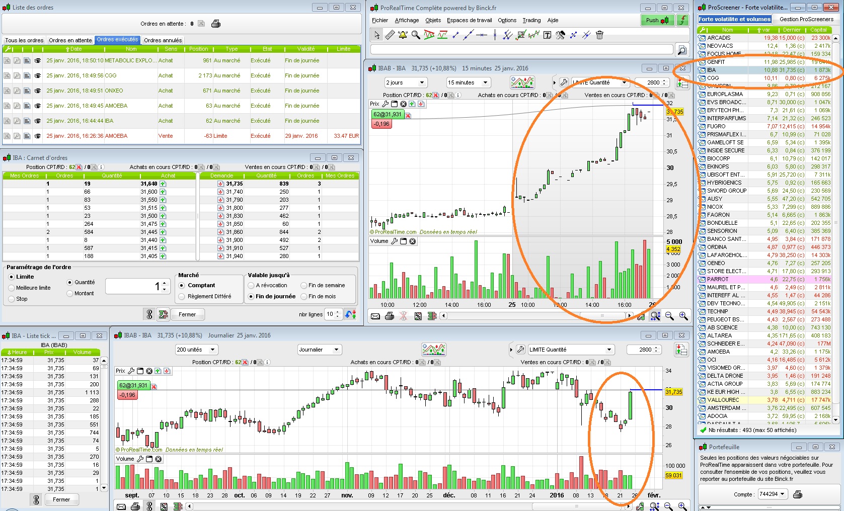 J'ai acheté le titre IBA pour 2000€, car le profil de la journée correspondait tout à fait à la stratégie:J'ai toujours des achats de 2000€ sur CGG, METABOLIC EXPLORER et ONXEO. Les deux premiers sont pour le moment négatifs quand ONXEO est sur le point d'entrée.Enfin j'ai pris un profit sympa sur AMOEBA:
