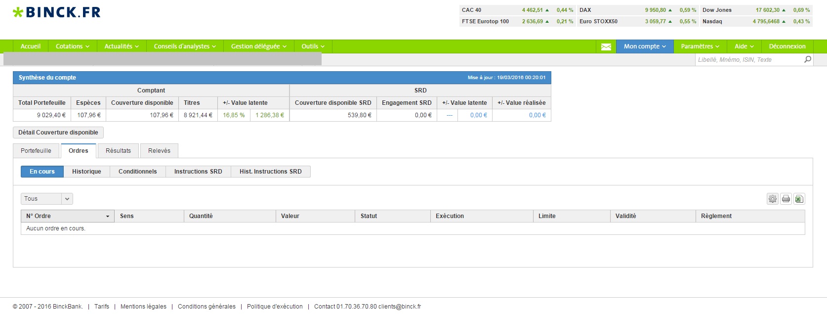 Concernant le courtage, j'ai été satisfait de l’exécution ainsi que des outils proposés par Binck, notamment la plateforme ProRealTime et les frais de courtages remboursés les deux premiers mois.