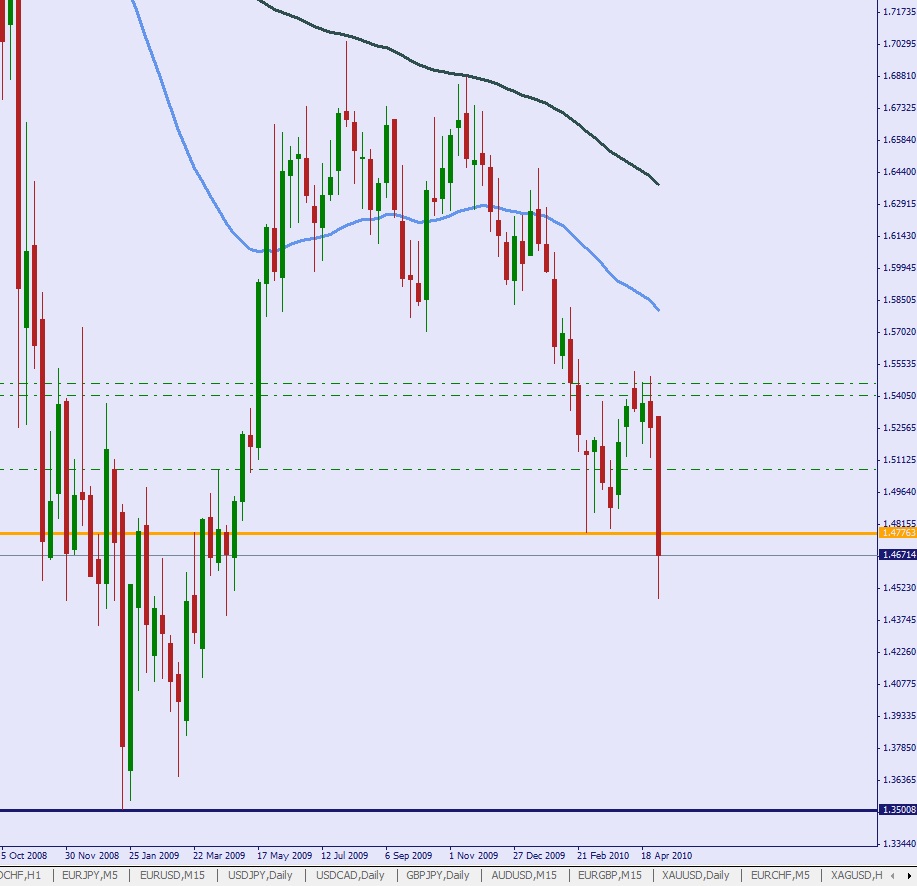 Le 6 mai restera une journée mémorable pour les marchés financiers ainsi que pour les devises qui ont connu des variations tous plus spectaculaire les unes que les autres. Les élections britanniques n’ont pas aidé à la livre sterling à reprendre de la force face au dollar américain bien au contraire. Le GBP/USD a chuté jusqu’à 1.4473 sont plus bas niveau depuis plus d’un an ayant brisé ainsi tous les supports sur son passage y compris le niveau Fibonacci 0 situé à 1.4785 qui nous servira de cible de retracement pour une correction possible du cours.