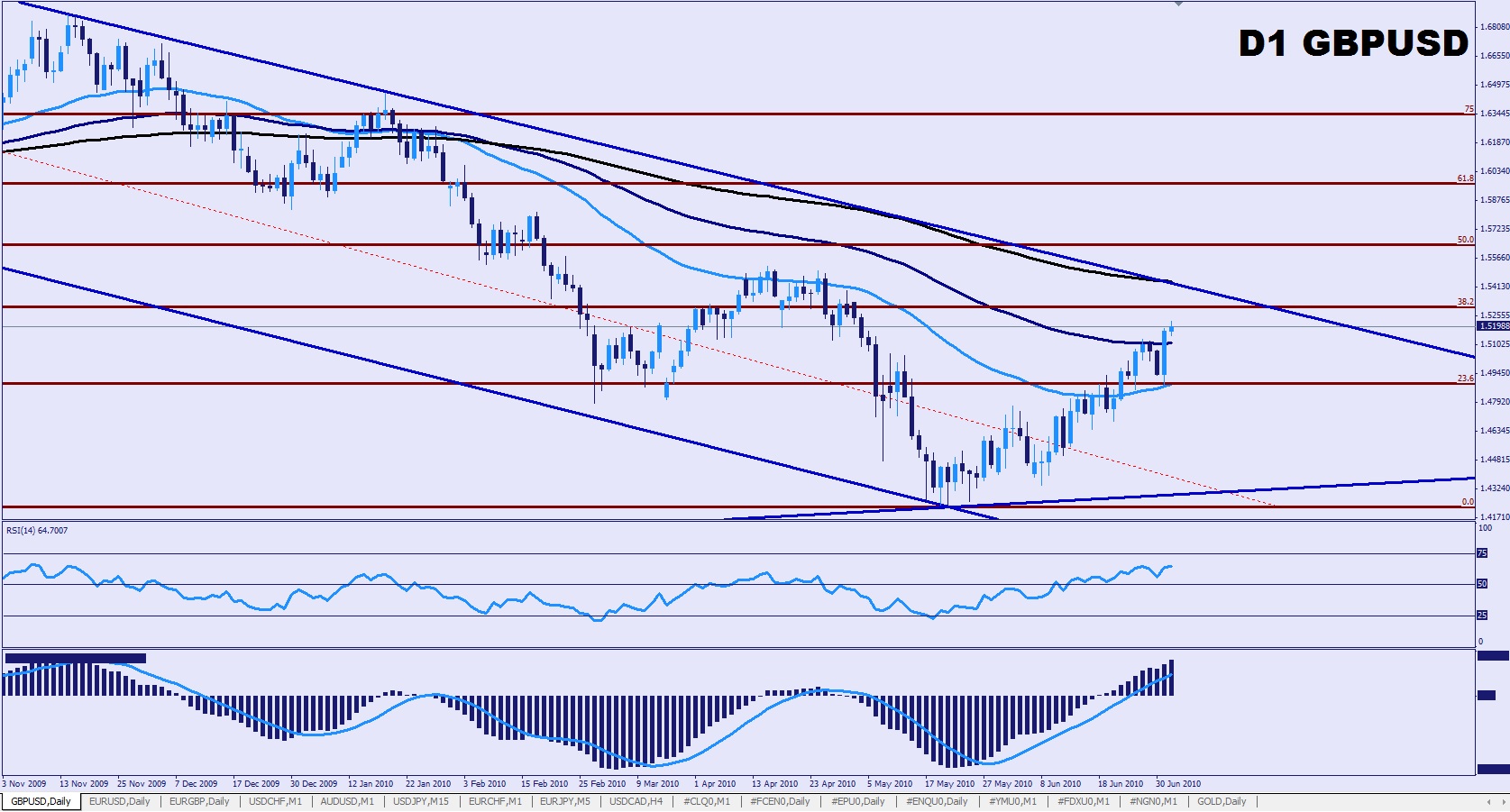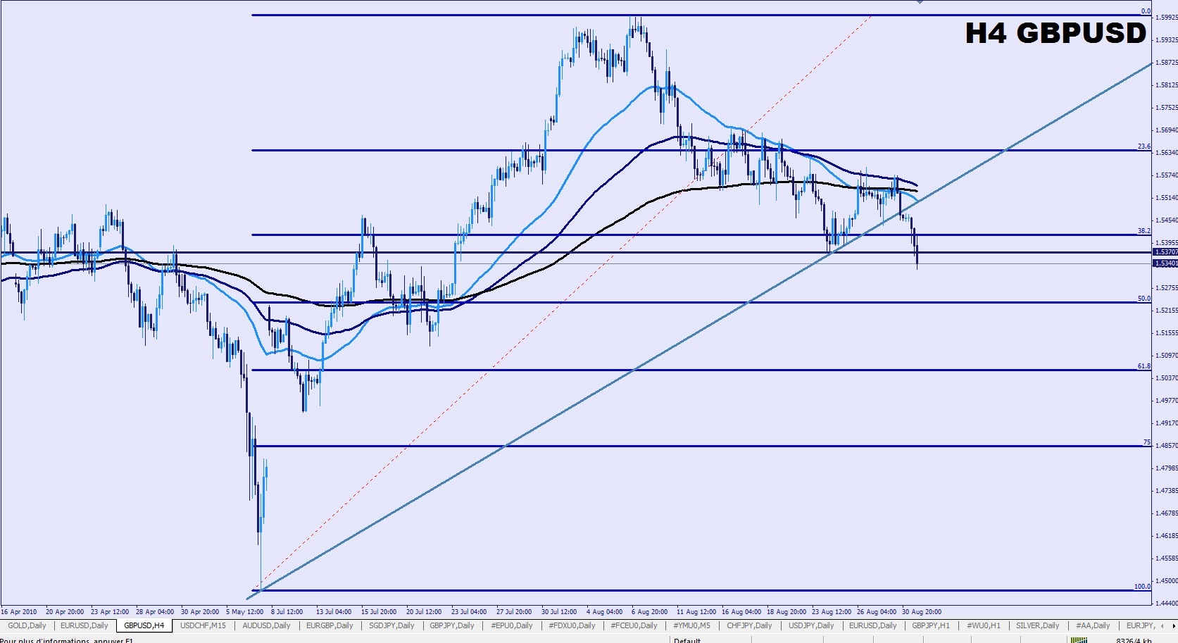 Désormais, avec le franchissement de la EMA 100 en graph journalier, je ne voit plus de zone de résistance majeure, qu'elles soient obliques ou horizontales, avant 1.53 / 1.54 (résistance oblique ou retracement des 38.2% de la dynamique baissière débuté en aout 2009).