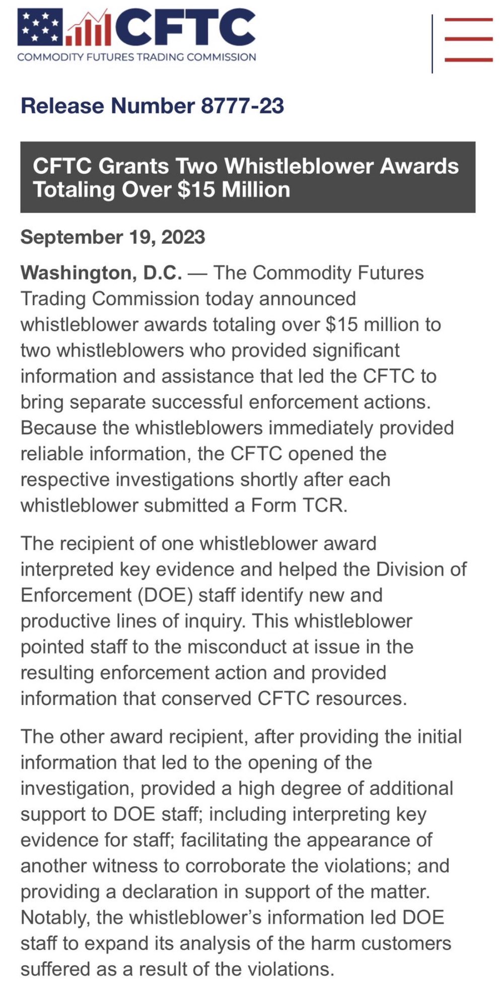 La CFTC (le régulateur US) annonce qu'elle va récompenser 2 personnes à hauteur de 15 Millions de dollars pour avoir fournies les informations nécessaires pour prouver les malversations de MFF :