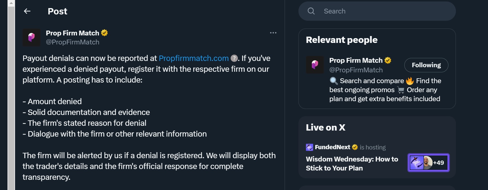 Sur l'excellent site "Prop Firm Match" : https://www.propfirmmatch.com/ , on peut désormais reporter, dans une section spéciale, un paiement qui aurait été refusé par une Prop Firm :