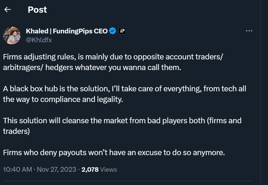 Il dit qu'il va s'occuper de tout mettre en place et qu'ainsi les Prop Firms n'auront plus aucune excuse pour refuser un paiement.