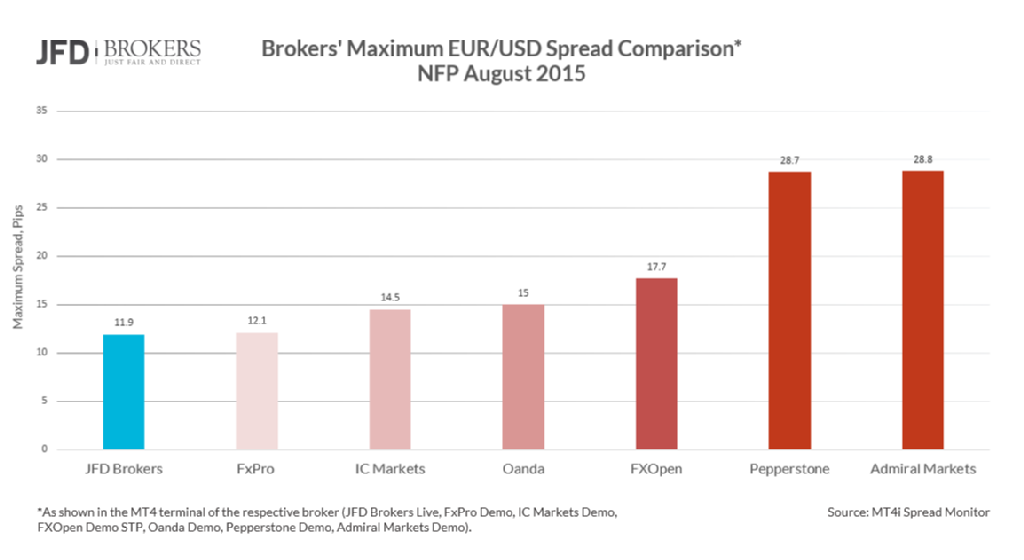 Voici ci-dessous une comparaison du spike (spread le plus haut enregistré) de JFD vs une sélection de brokers connus, sérieux et régulés.